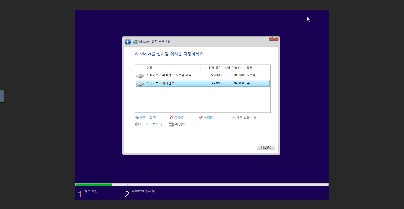 - 드라이브 0 파티션 2 를 선택하고 다음 버튼을 클릭 합니다.