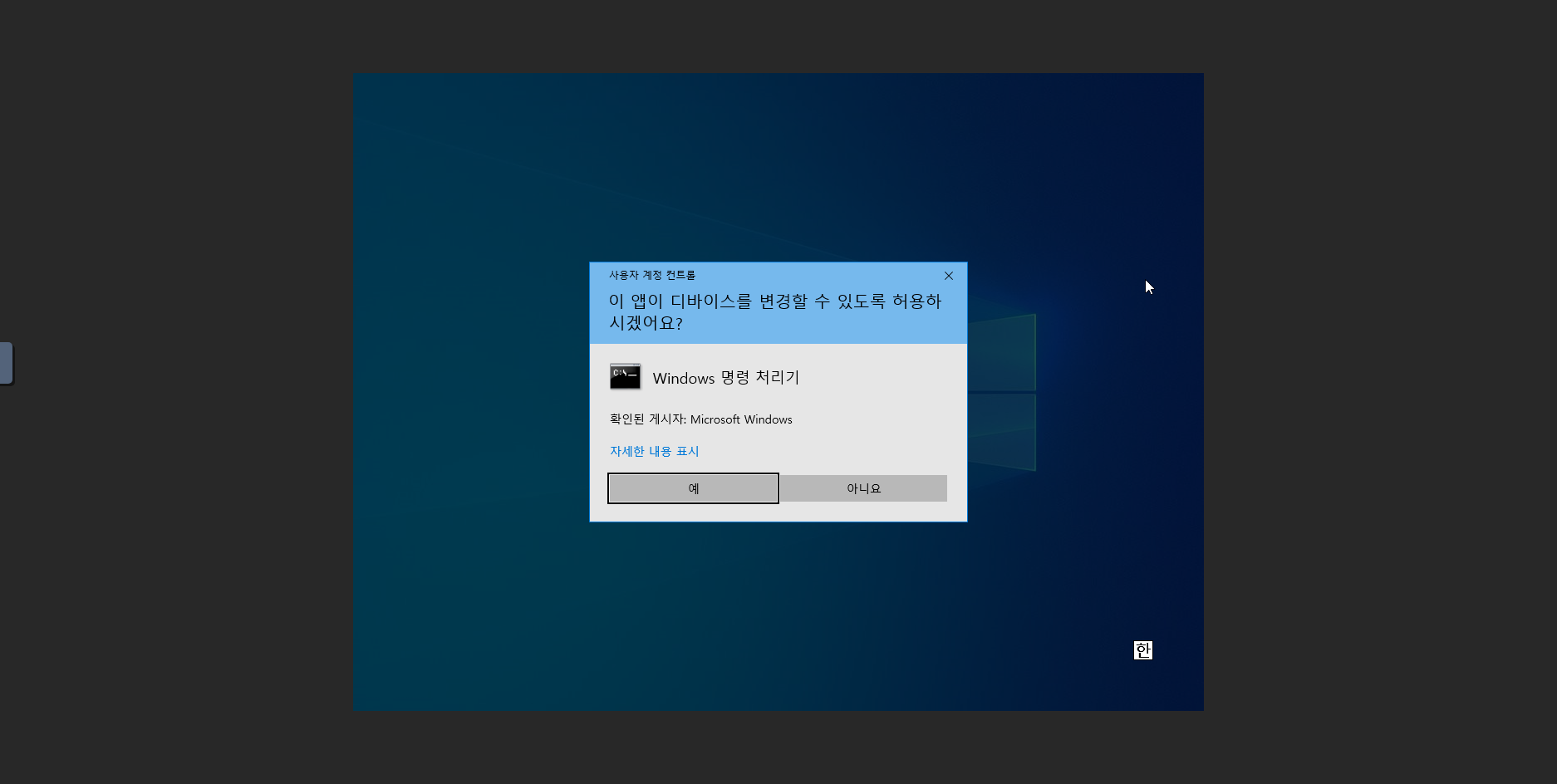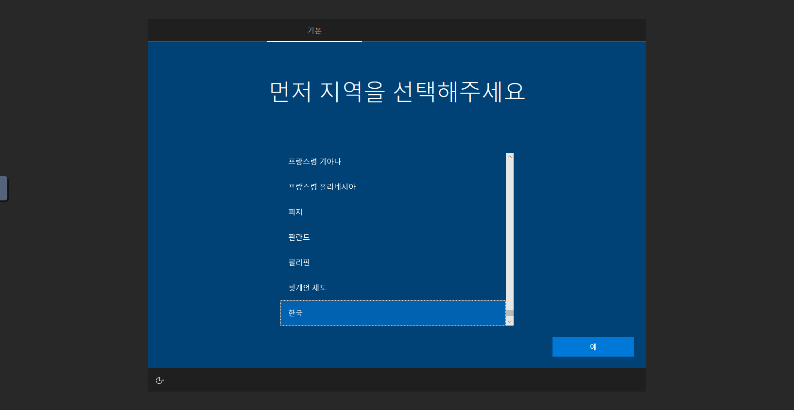 - 한국 을 선택 후 예 버튼을 클릭 합니다.