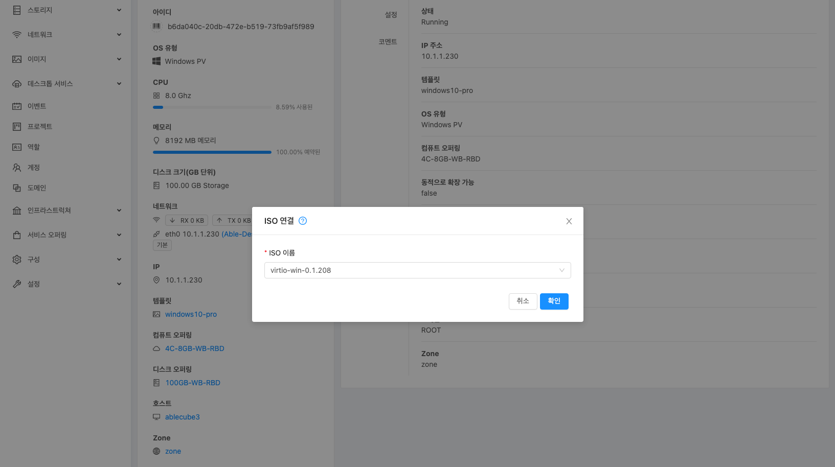 선택 박스에서 virtio-win-0.1.208 ISO 선택 하고 확인 버튼을 클릭 합니다.