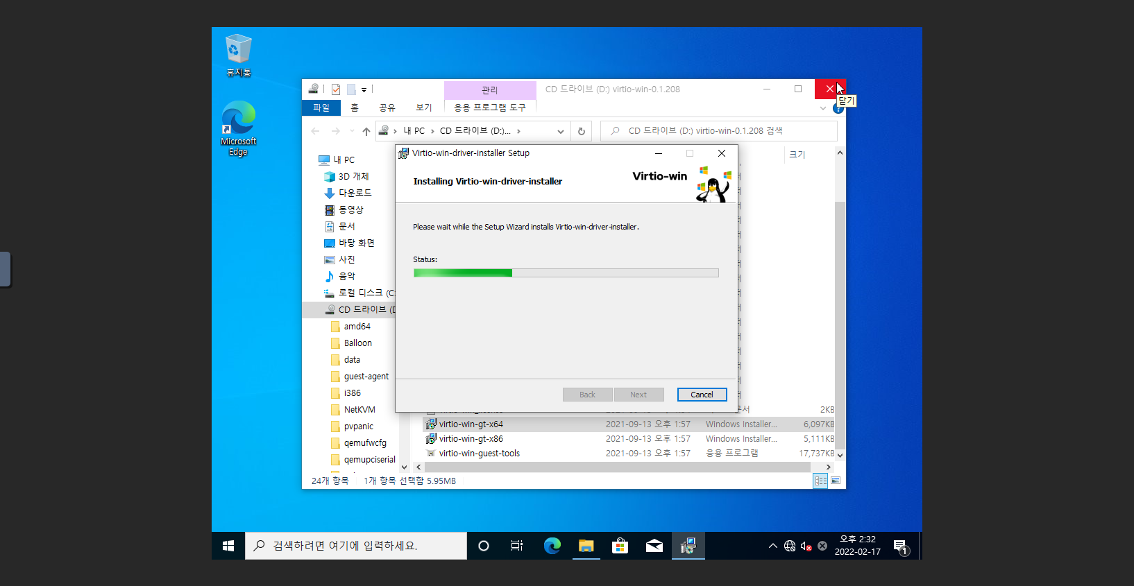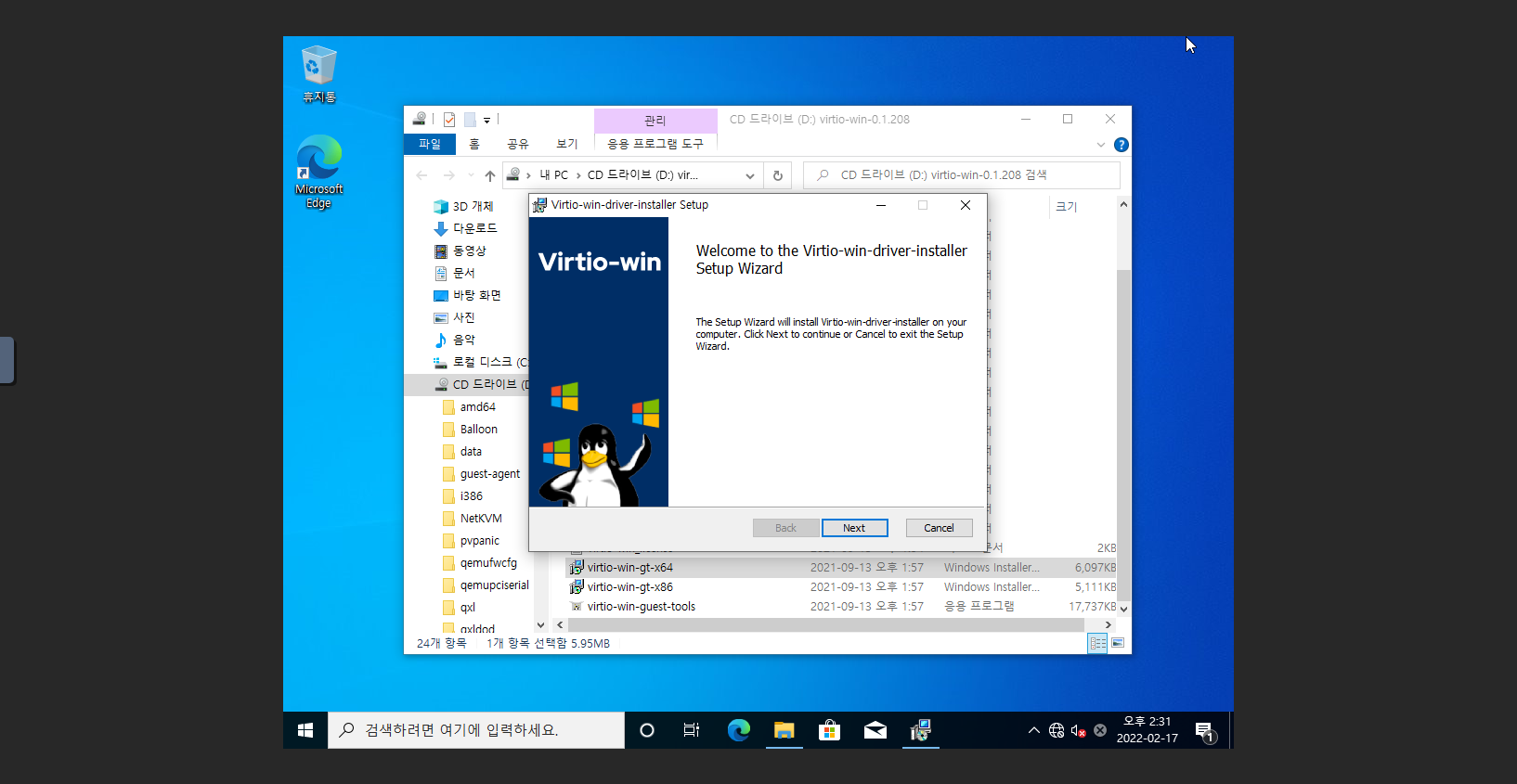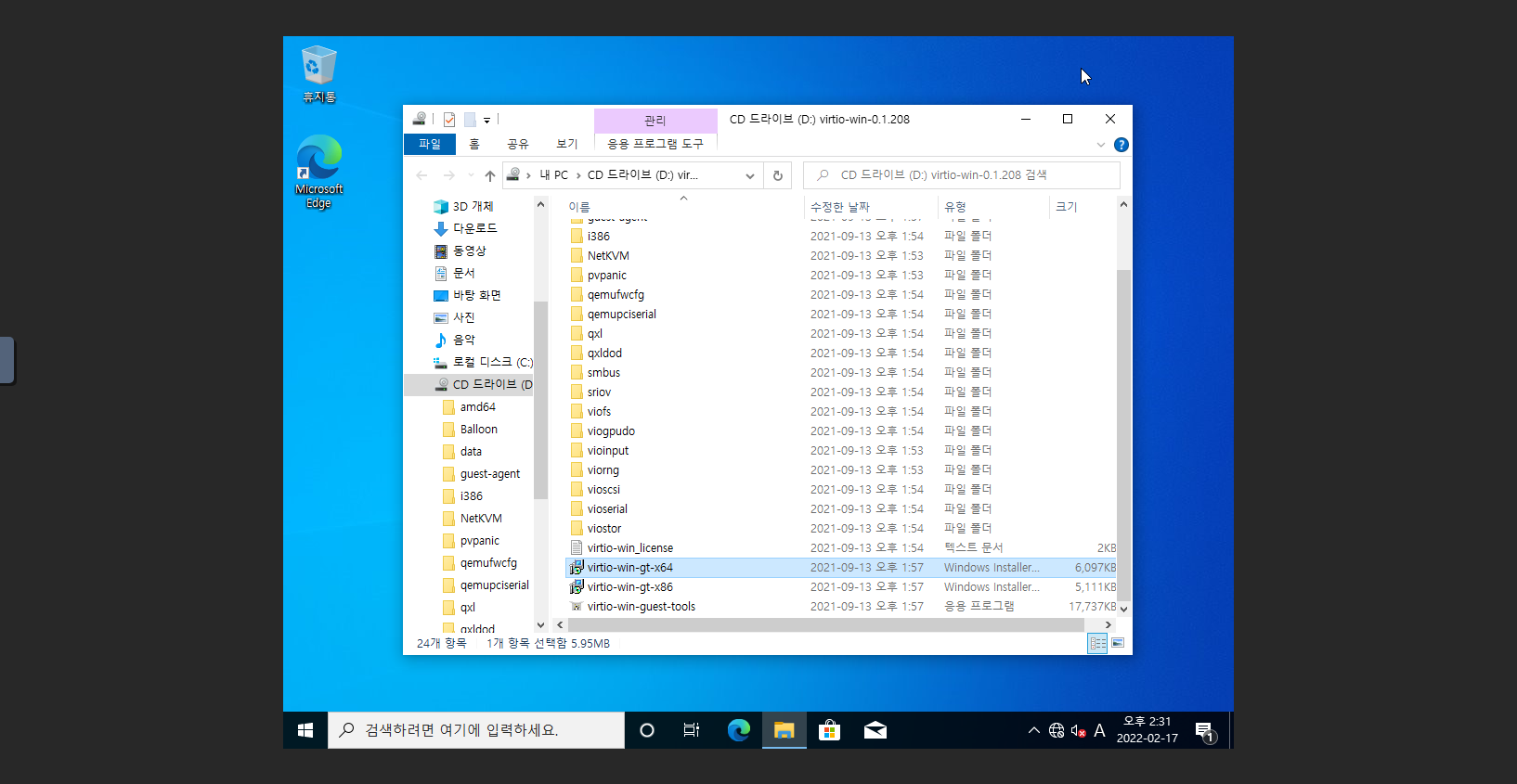 2. D: 드라이브 폴더로 이동 후 virtio-win-gt-x64 실행 파일을 실행 합니다.