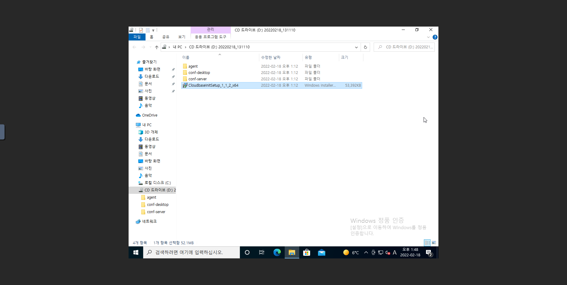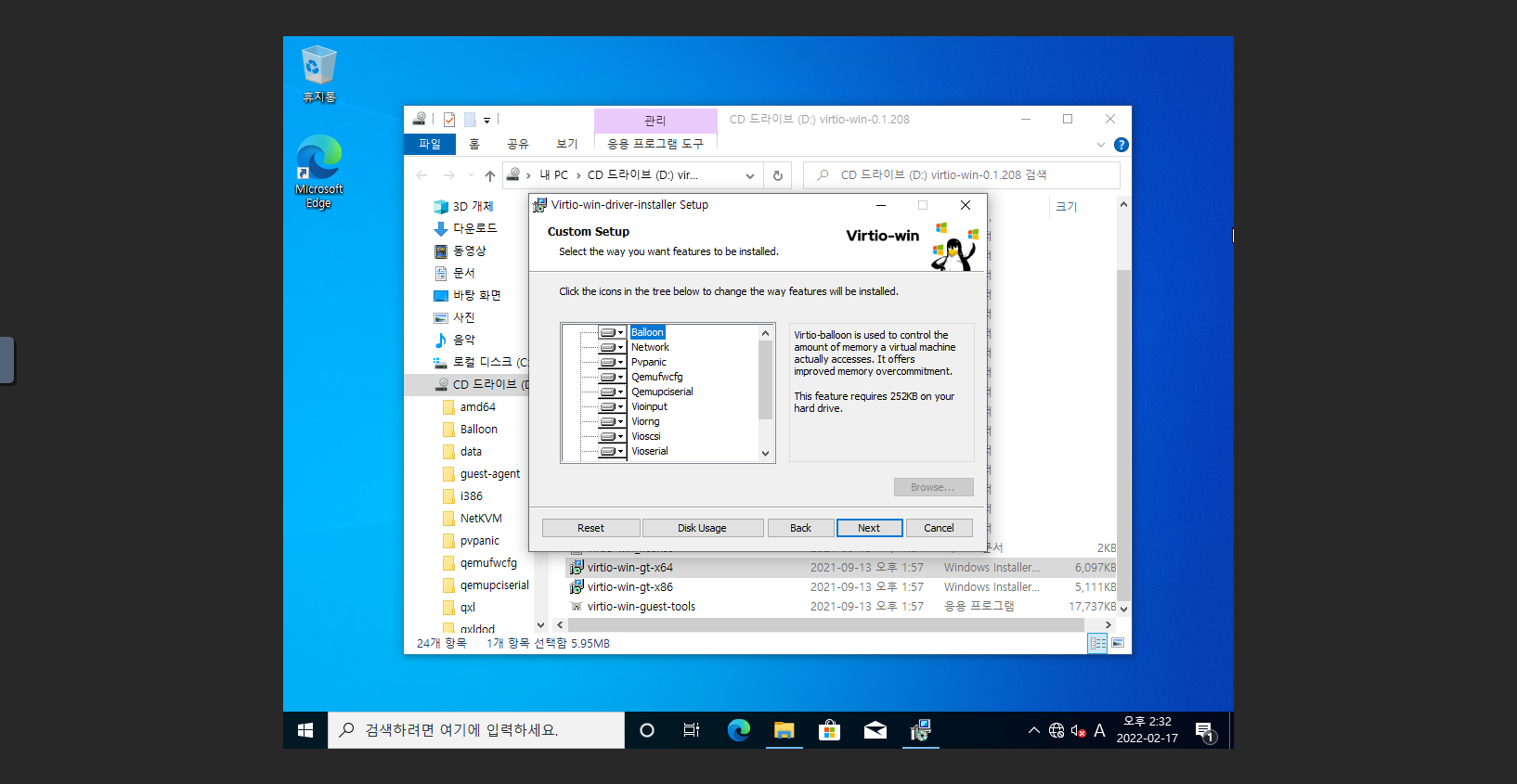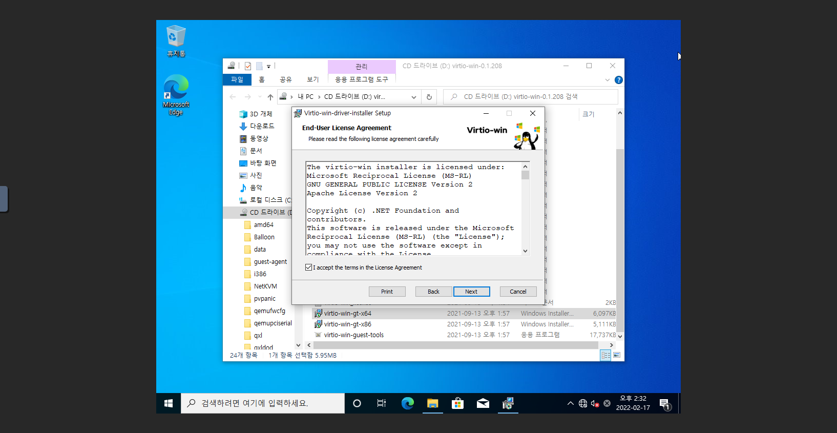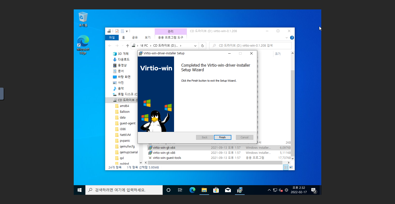 2. D: 드라이브 폴더로 이동 후 virtio-win-gt-x64 실행 파일을 실행 합니다.