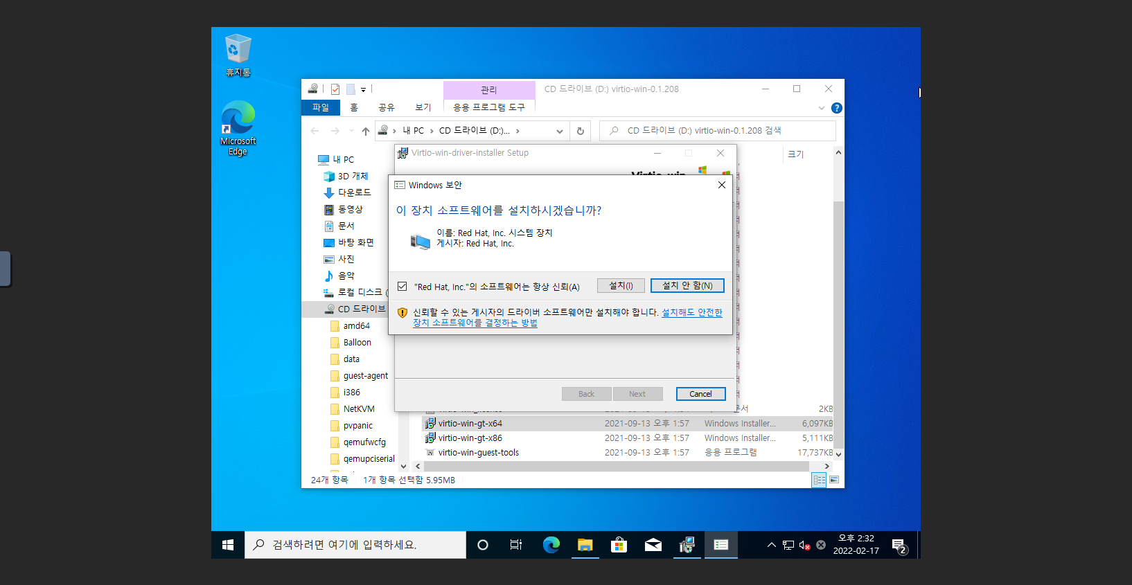 - CD 드라이브 (D:): virtio-win-0.1.208 을 선택 합니다.