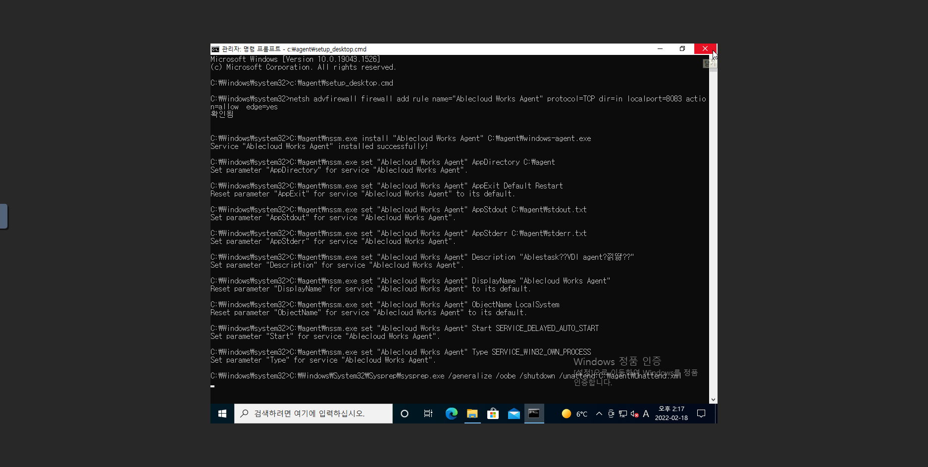 13. 명령 프롬프트 를 관리자 권한으로 실행 한 후에, C:\agent\setup_desktop.cmd 명령어를 실행 시키면 가상머신이 Sysprep 진행후 가상머신이 정지 됩니다.