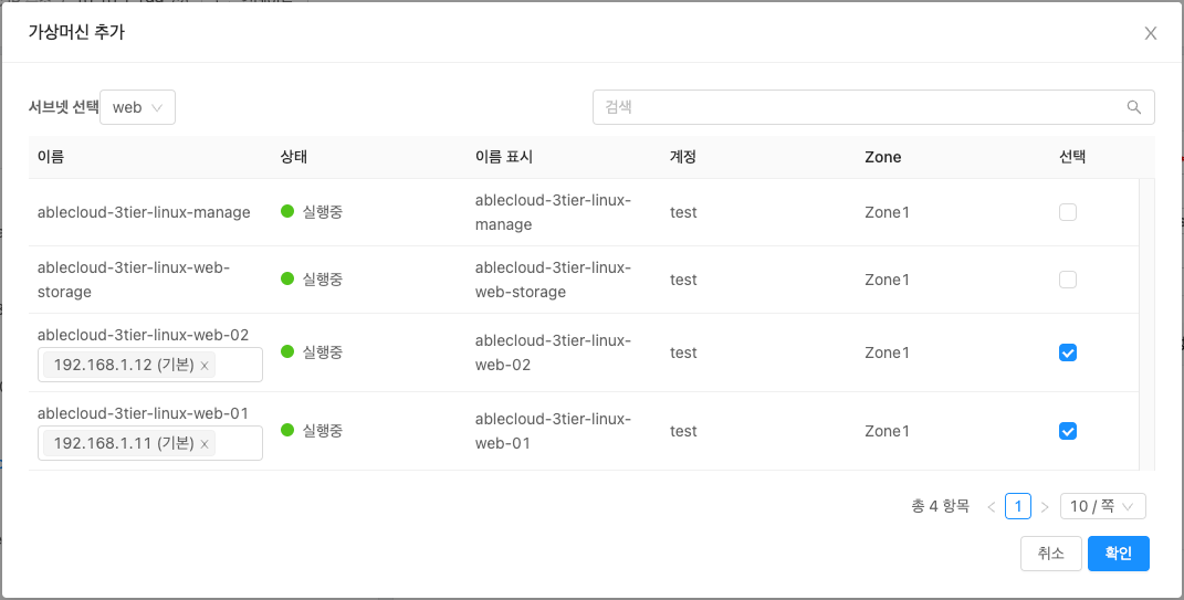 가상머신 추가 버튼을 클릭하고 서브넷을 선택한 후 WEB 가상머신 1,2 를 할당합니다.