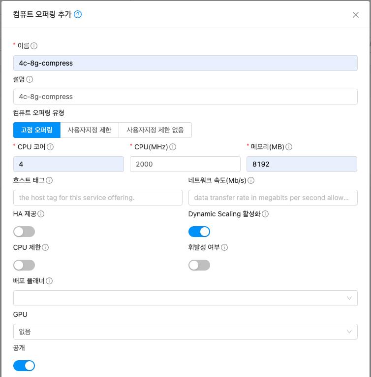 - 서비스 오퍼링 > 컴퓨트 오퍼링 메뉴에서 컴퓨트 오퍼링 추가 버튼을 클릭하여 서비스 오퍼링 생성 화면을 볼러온다.