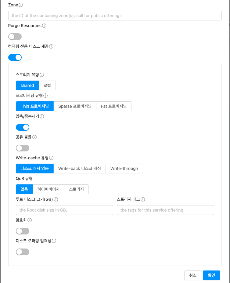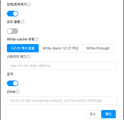 압축/중복제거 기능을 사용하기 위해서는 디스크 오퍼링 및 서비스 오퍼링에 압축/중복제거 옵션이 적용되어 있어야 사용할 수 있습니다.