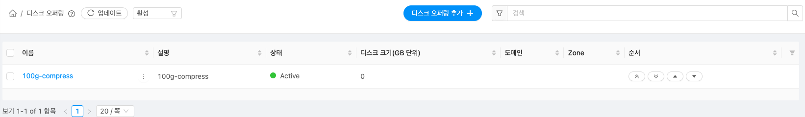 - 서비스 오퍼링 > 디스크 오퍼링 메뉴에서 디스크 오퍼링 추가 버튼을 클릭하여 디스크 오퍼링 생성 화면을 볼러온다.