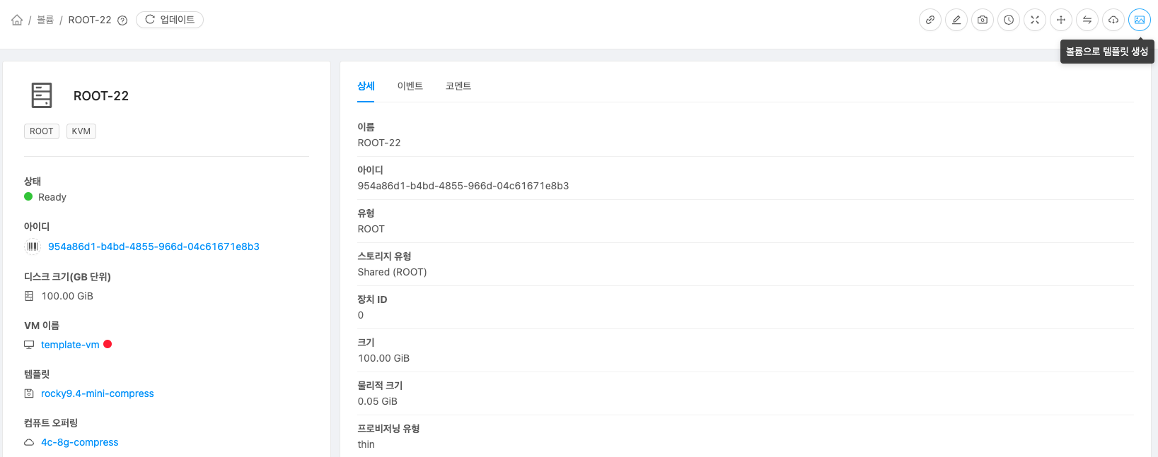 - 스토리지 > 볼륨 메뉴에서 템플릿 생성할 ROOT 디스크를 선택하여 상세 화면으로 이동한다.