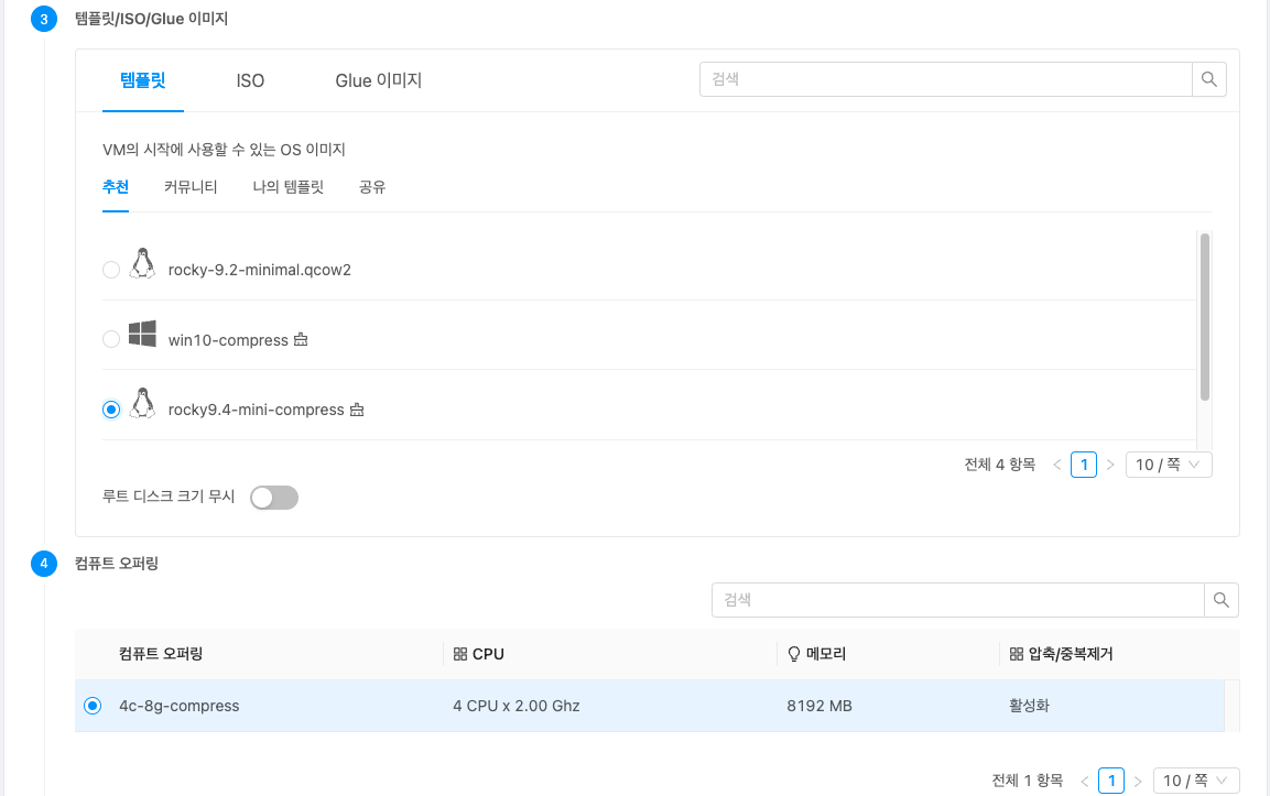 ISO를 이용하여 가상머신을 만들때 압축/중복제거가 적용된 디스크 오퍼링으로 ROOT 디스크를 생성하여 가상머신을 만드는 방법을 확인할 수 있습니다.
