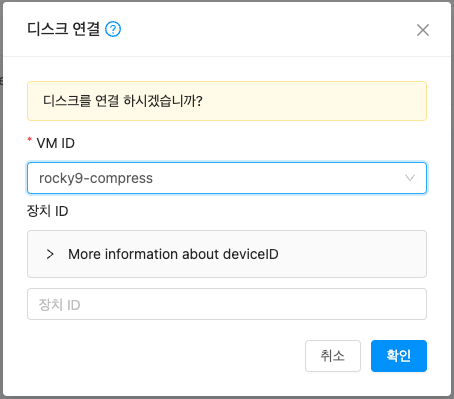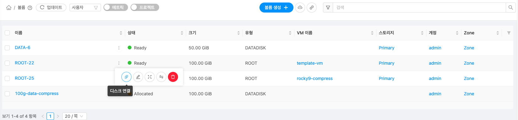 - 스토리지 > 볼륨 메뉴화면에서 연결할 디스크 액션버튼 중 디스크 연결 버튼을 클릭한다.