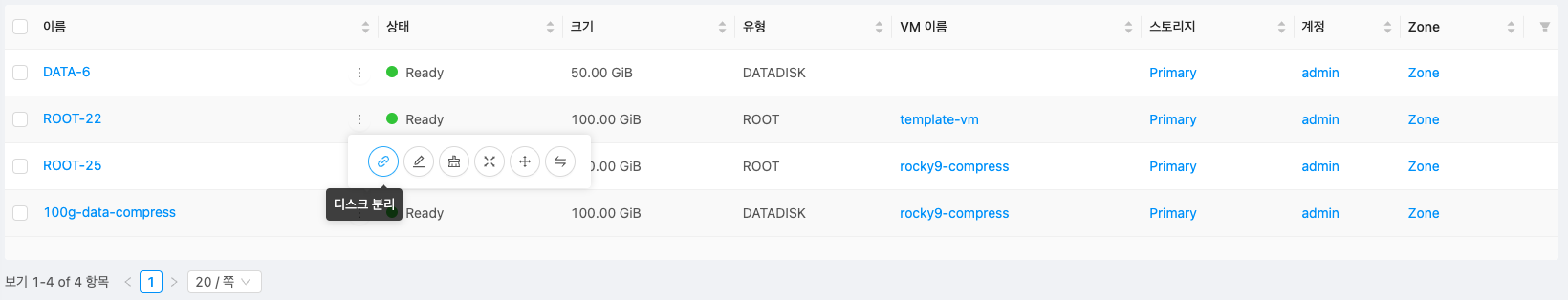 - 스토리지 > 볼륨 메뉴화면에서 해제할 디스크 액션버튼 중 디스크 연결 버튼을 클릭한다.