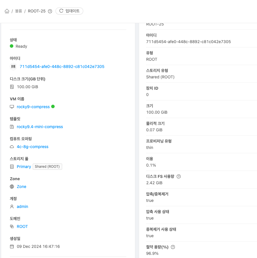 템플릿을 이용하여 가상머신을 만들때 압축/중복제거가 적용된 디스크 오퍼링으로 ROOT 디스크를 생성하여 가상머신을 만드는 방법을 확인할 수 있습니다.