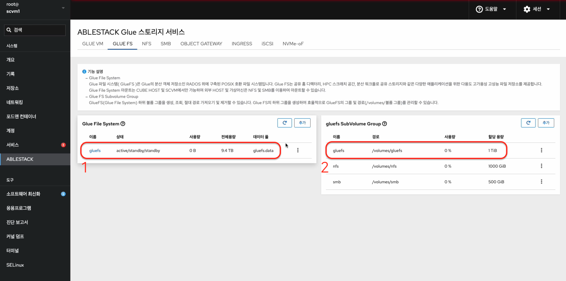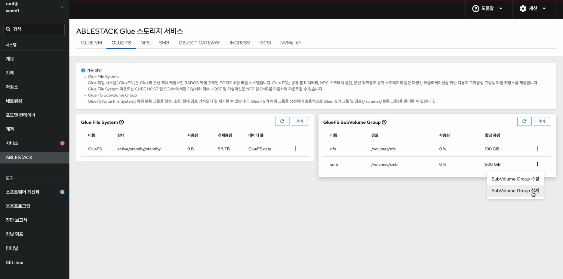- Glue FS Service 및 Glue FS Subvolume Group을 확인하는 화면입니다.