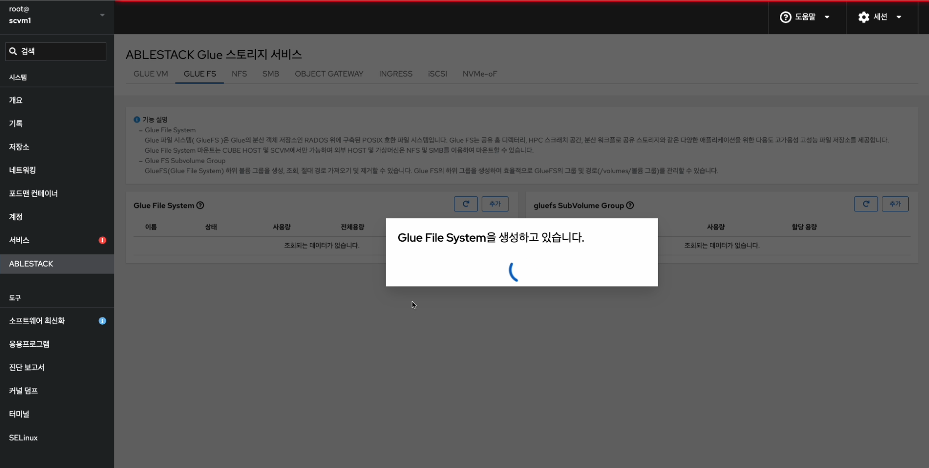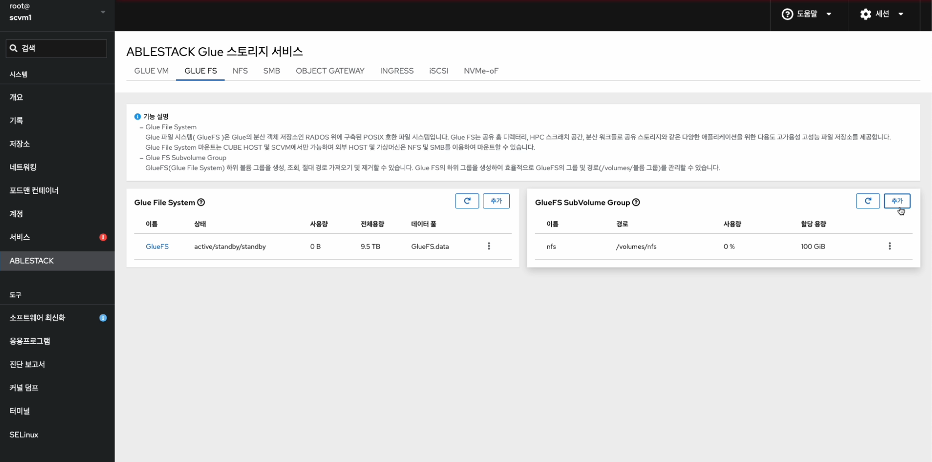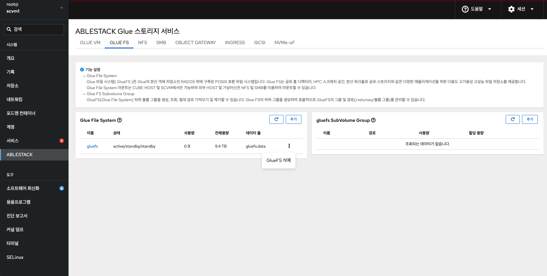 - ABLESTACK 메인 화면에서 상단 GLUE FS 메뉴를 클릭한 화면입니다.