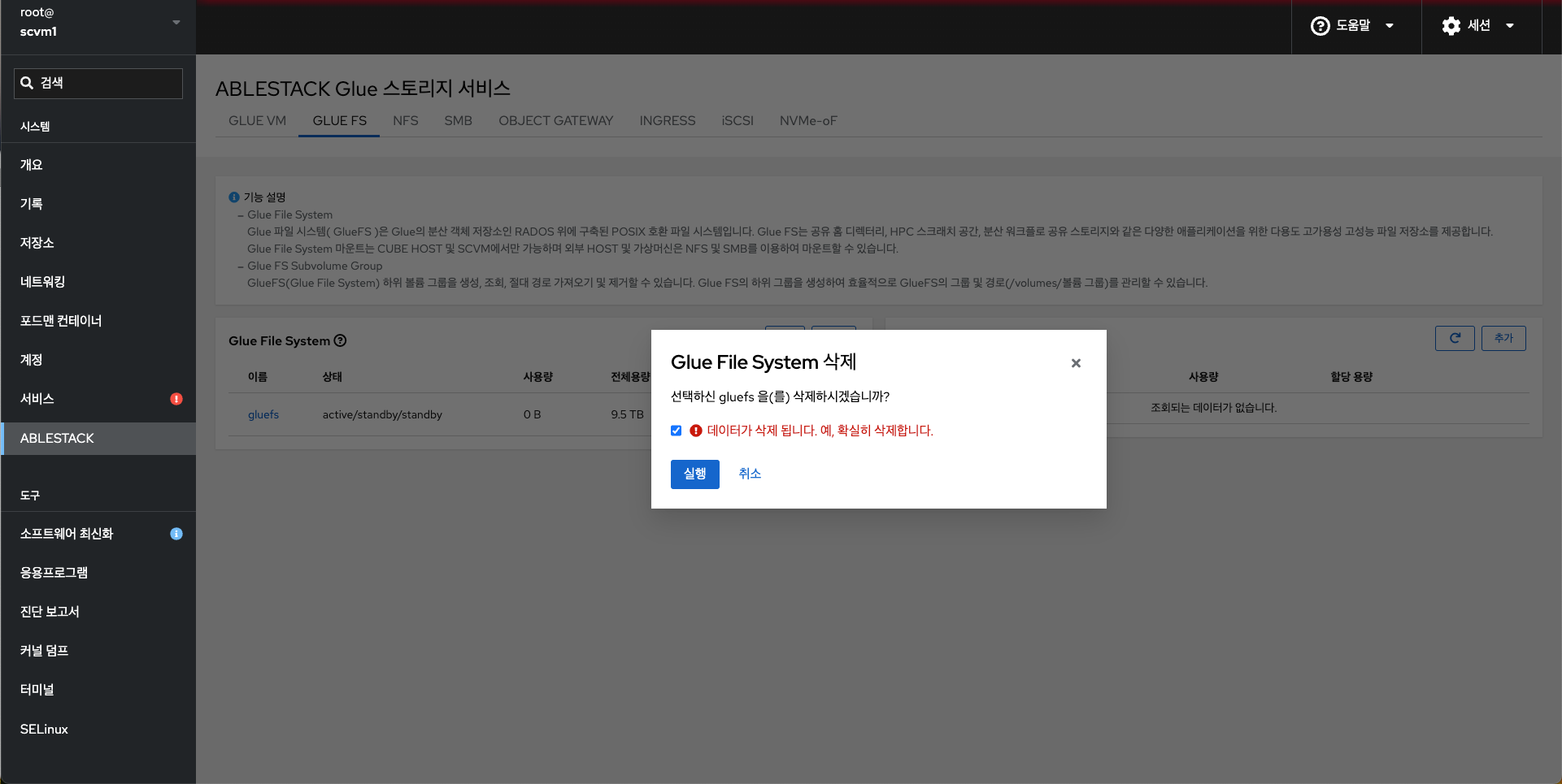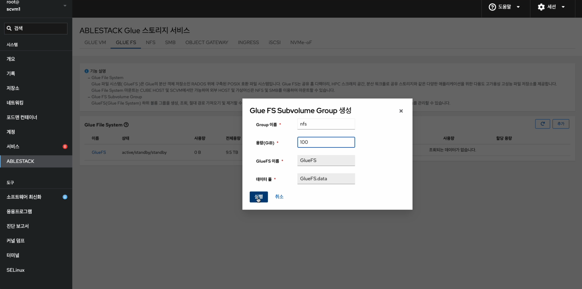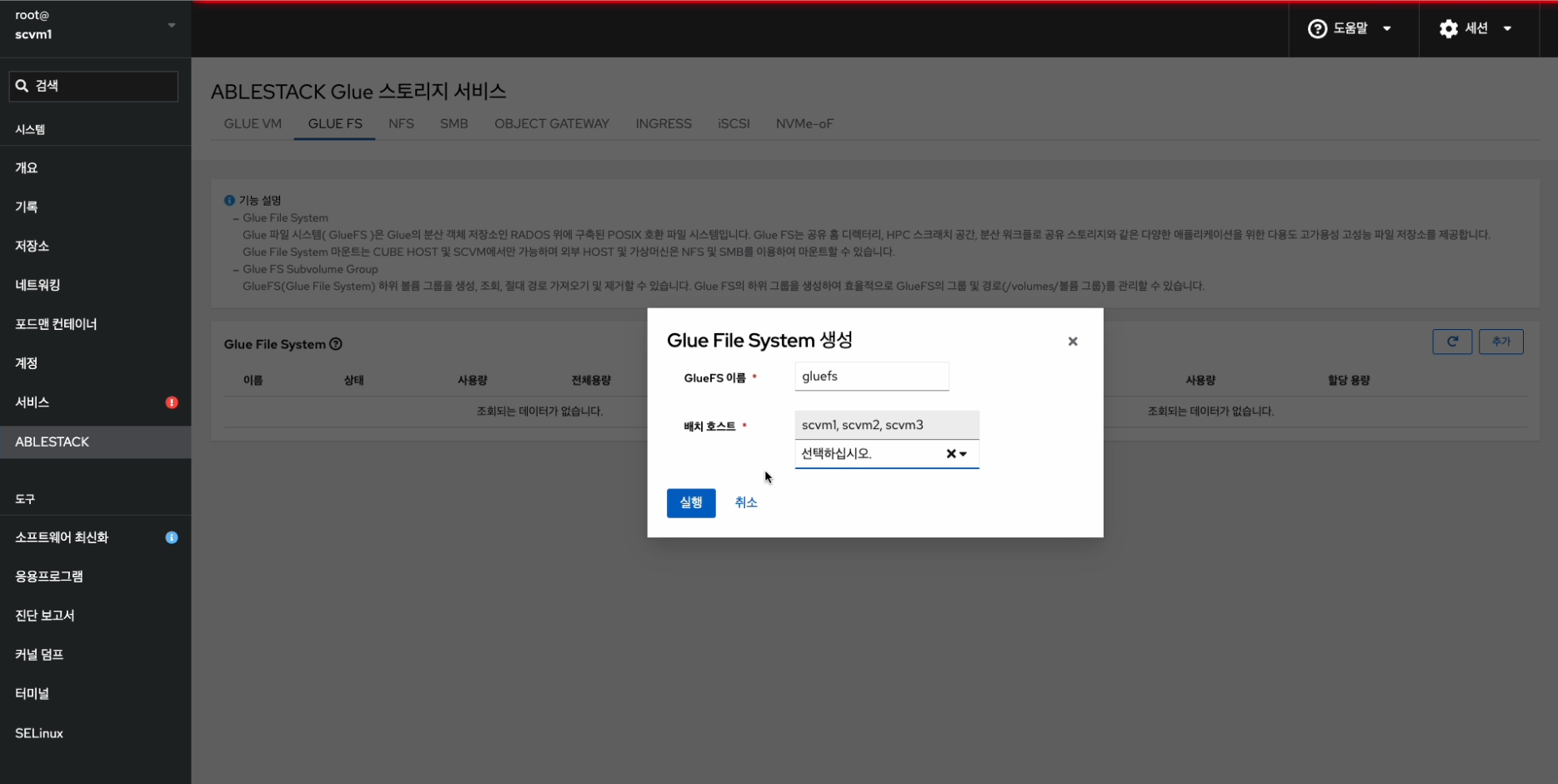 - ABLESTACK 메인 화면에서 상단 GLUE FS 메뉴를 클릭한 화면입니다.