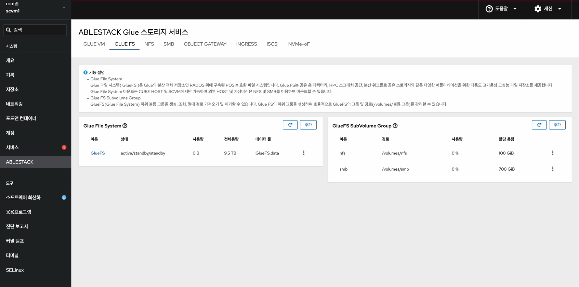 ABLESTACK Glue Service는 호스트가 아닌 Storage Center Virtual Machine(SCVM)에서 제공되고 있습니다.