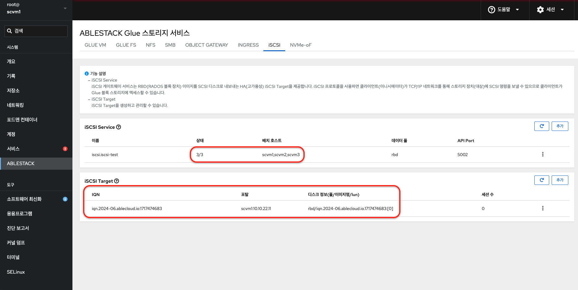 - Glue iSCSI Service 및 iSCSI Target을 확인하는 화면입니다.