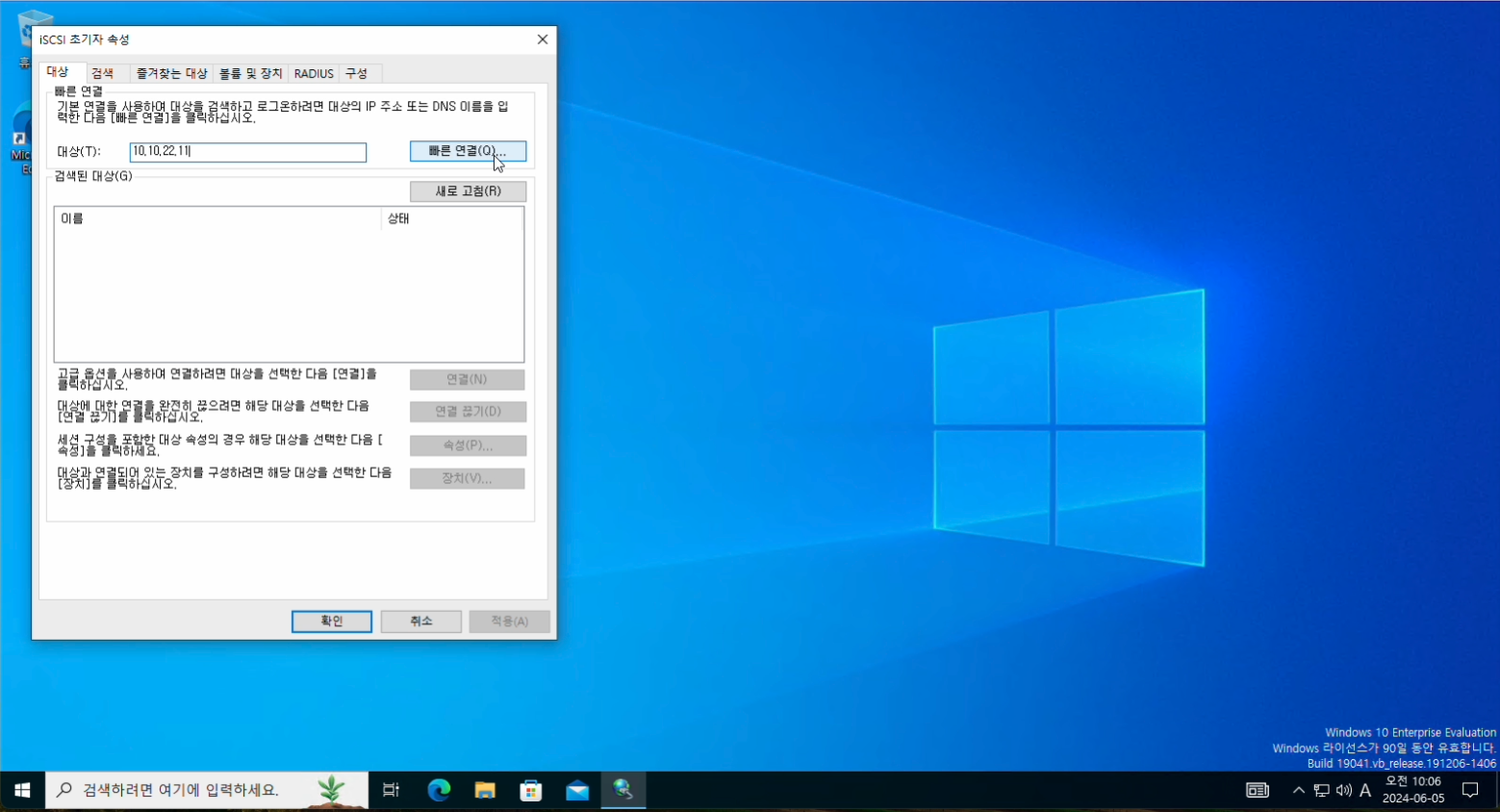 - iSCSI 초기자 속성 에서 대상 부분에 Glue iSCSI Service에서 확인한 포탈 을 입력 합니다.