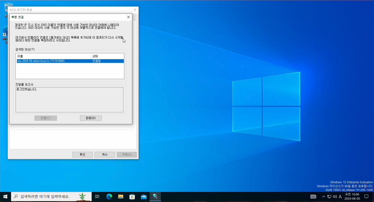 마운트 확인mount | grep /mnt/test 또는 df -h | grep /mnt/testIQN 로그아웃iscsiadm -m node -T iqn.2024-06.ablecloud.io:1717474683 -u