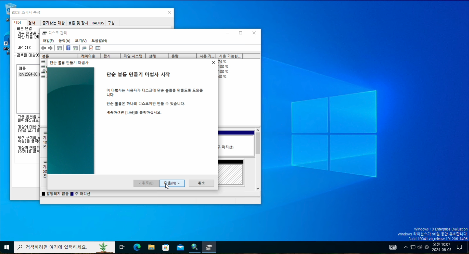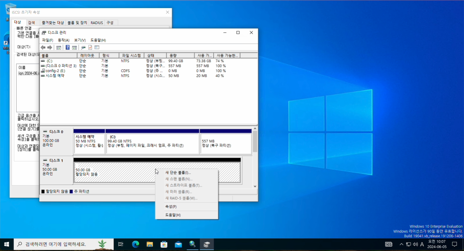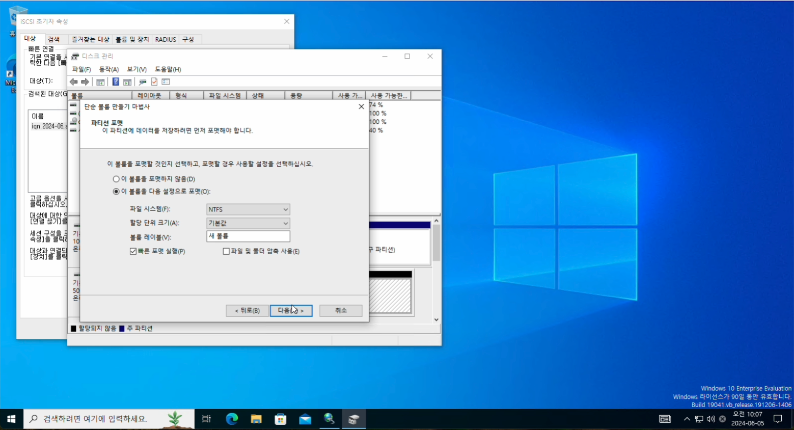 - 붙은 iSCSI 디스크 볼륨 을 먼저 초기화를 진행 합니다.
