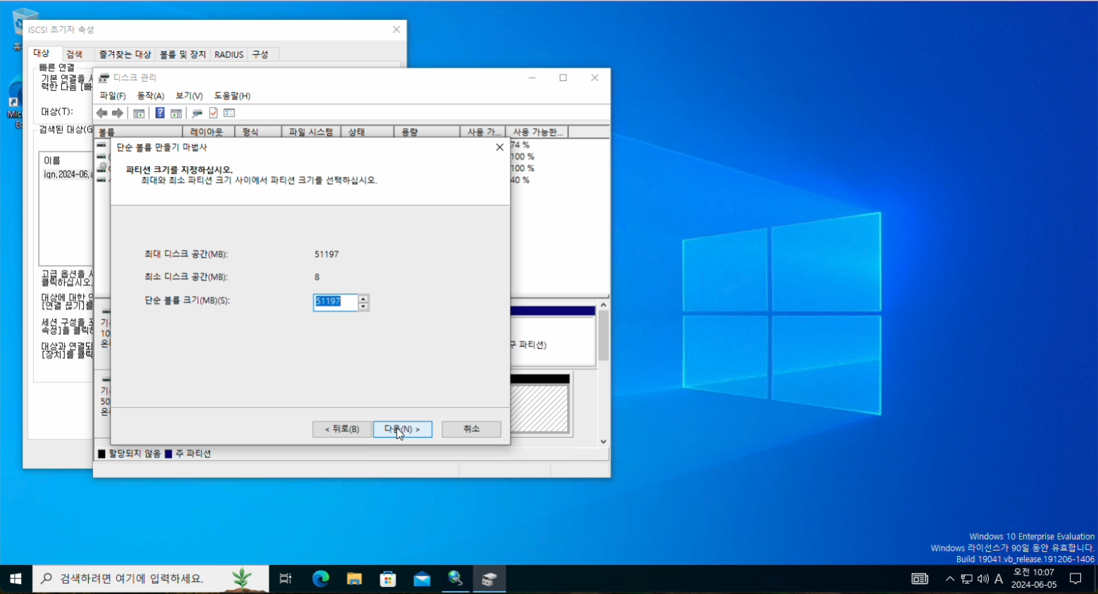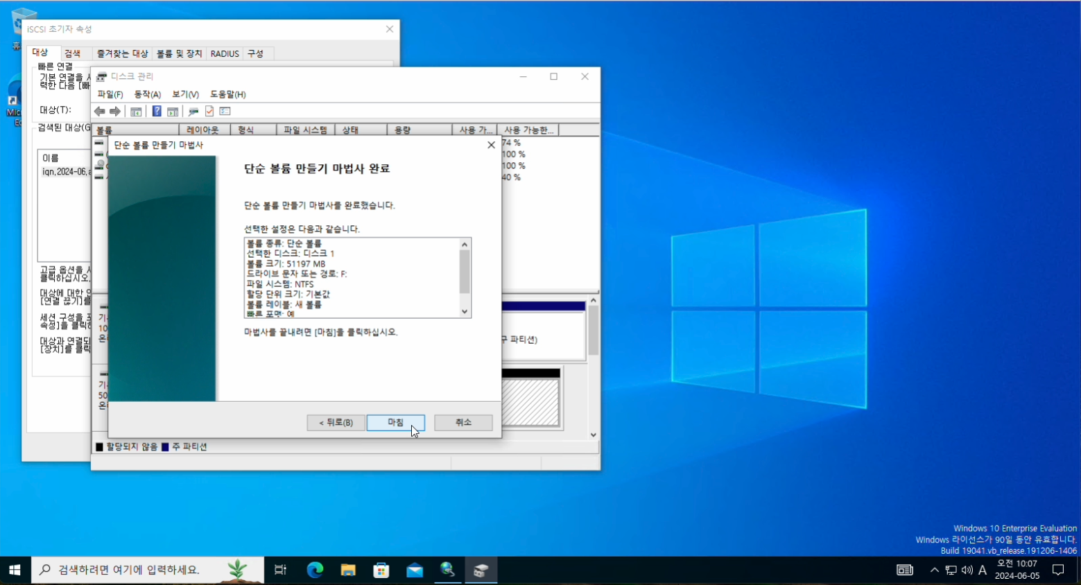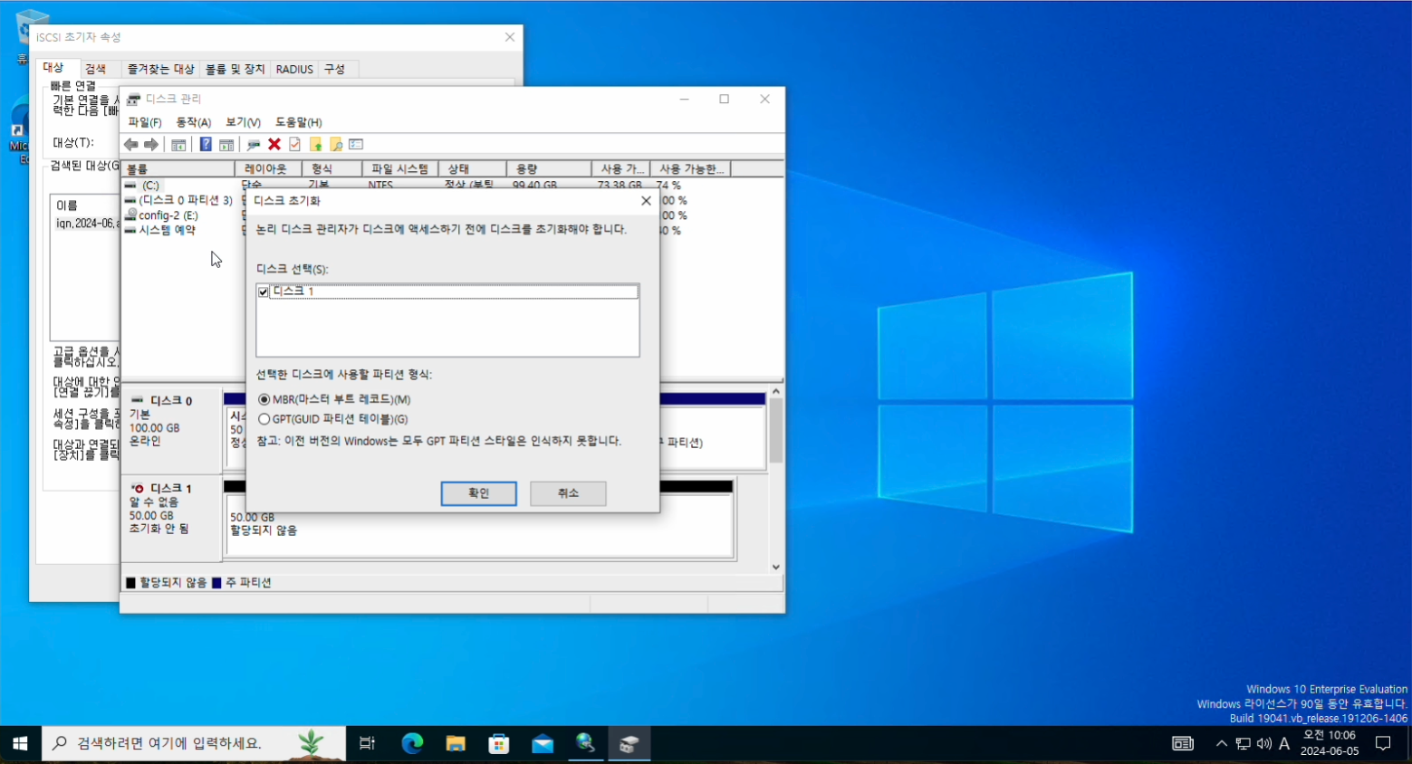- 붙은 iSCSI 디스크 볼륨 을 먼저 초기화를 진행 합니다.