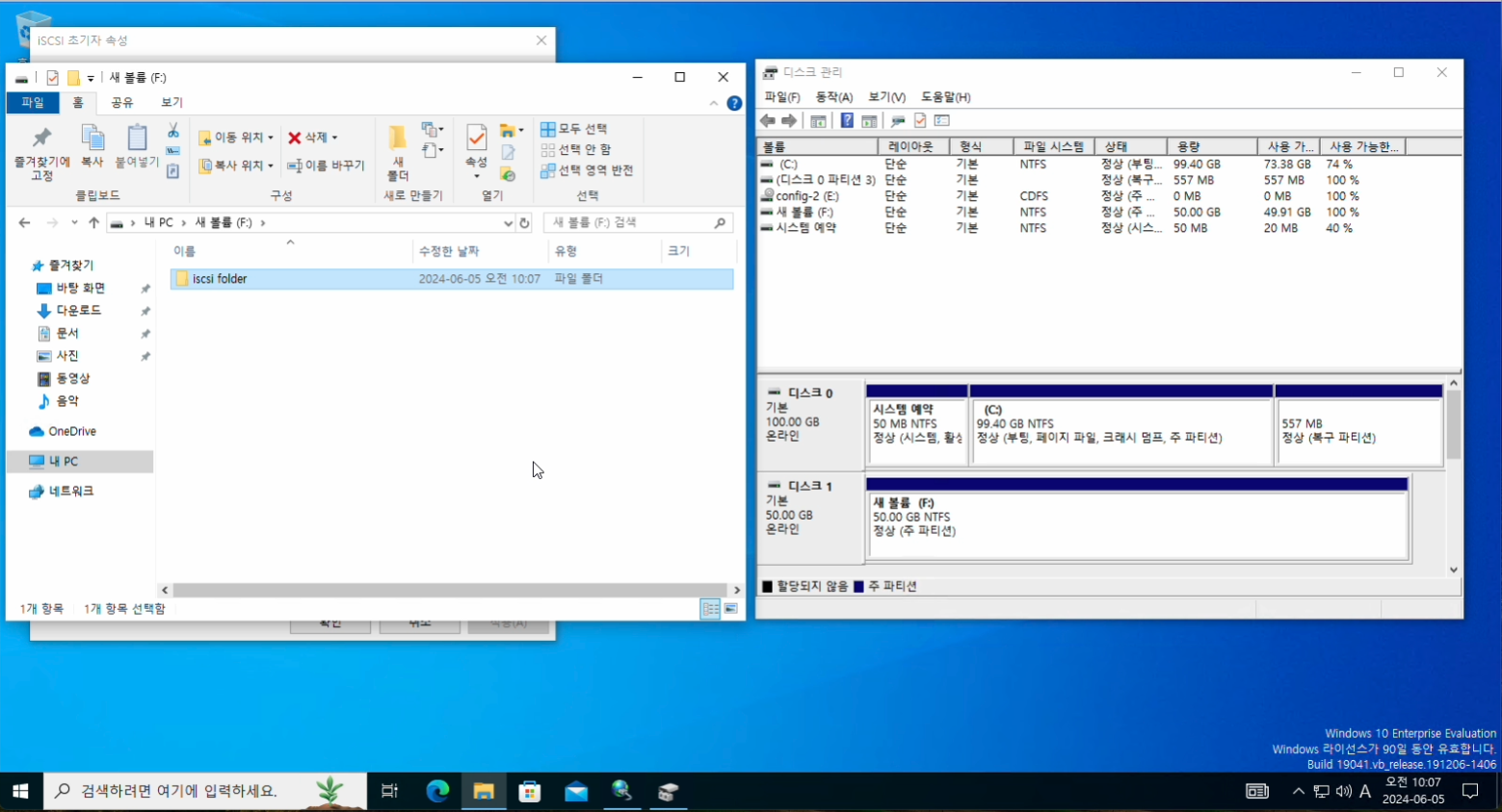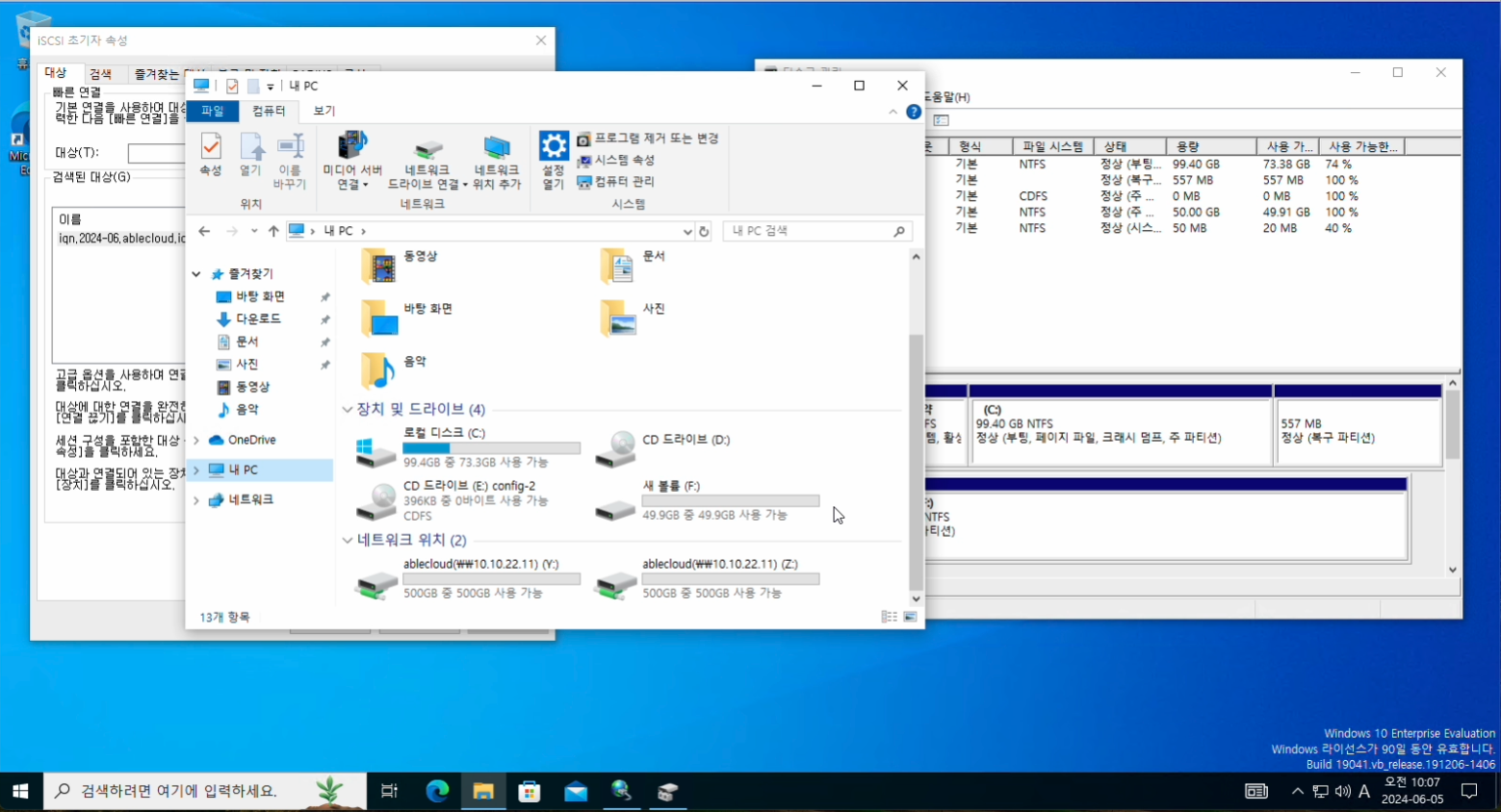 - 내 PC 로 이동하여, iSCSI 디스크 볼륨 이 용량 및 드라이브 문자 할당 이 정상적으로 되었는 지 확인 합니다.