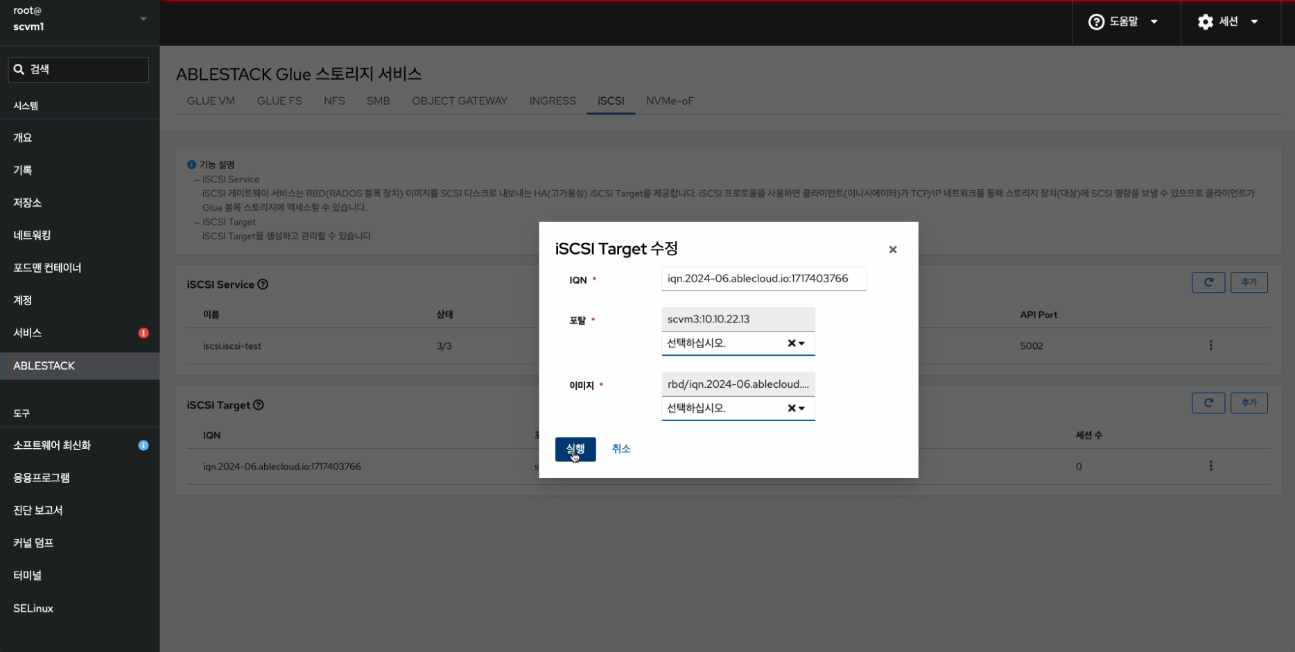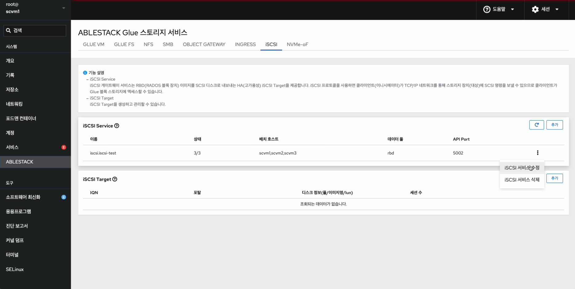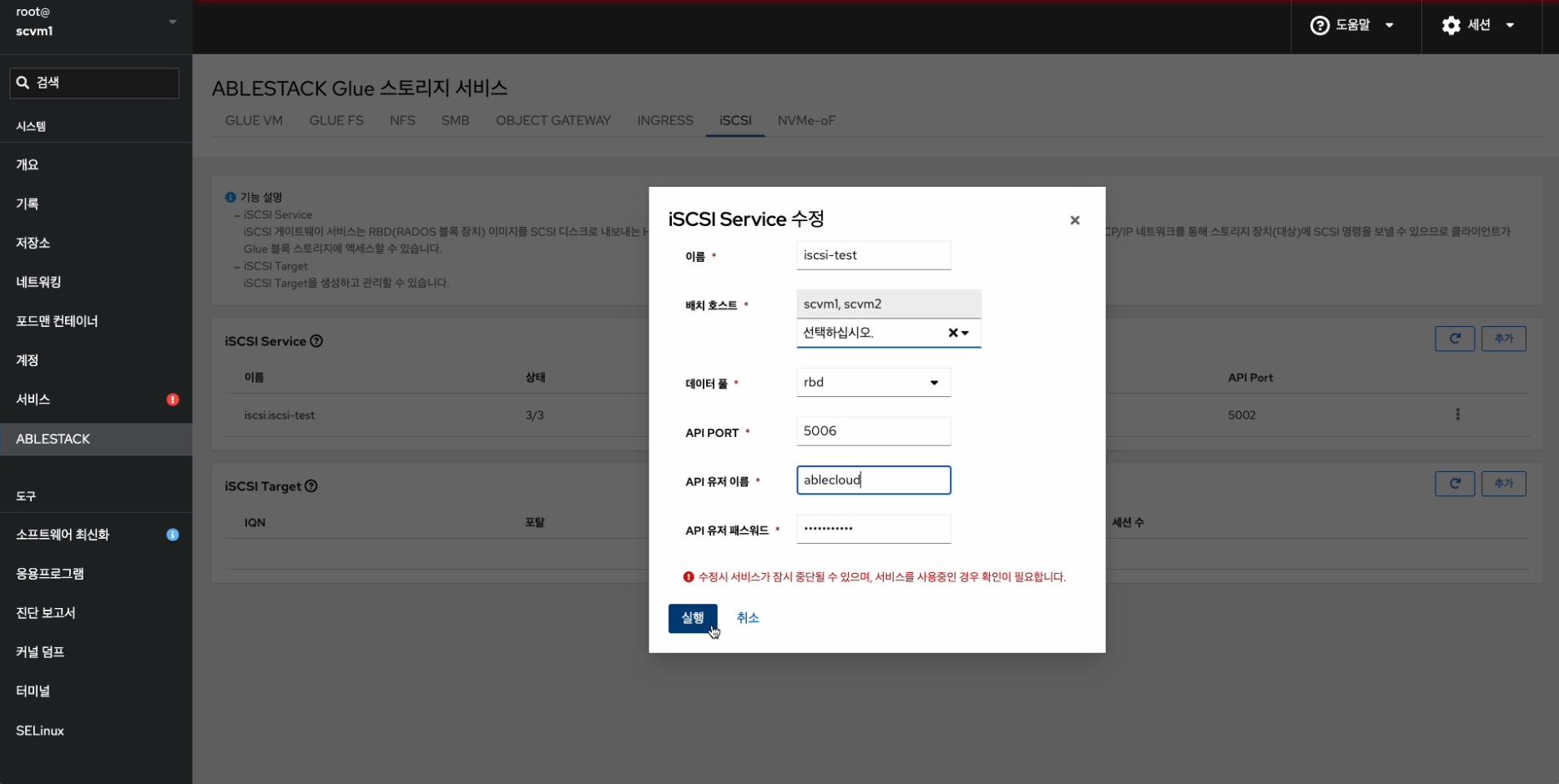ABLESTACK Glue iSCSI 서비스를 수정 할 시, 서비스가 정상 동작을 하지 않을 수도 있습니다.