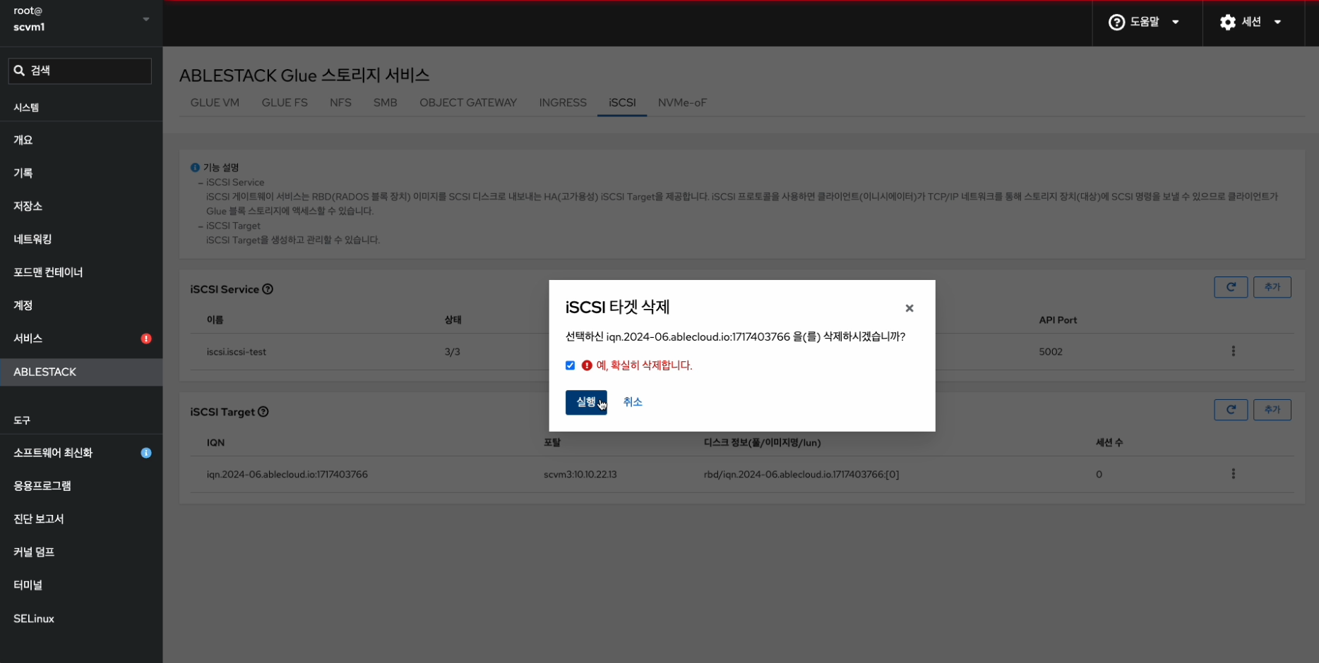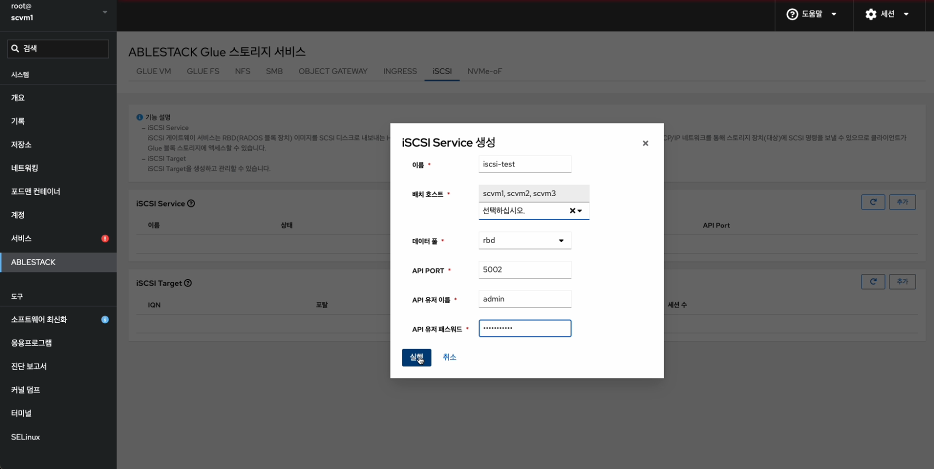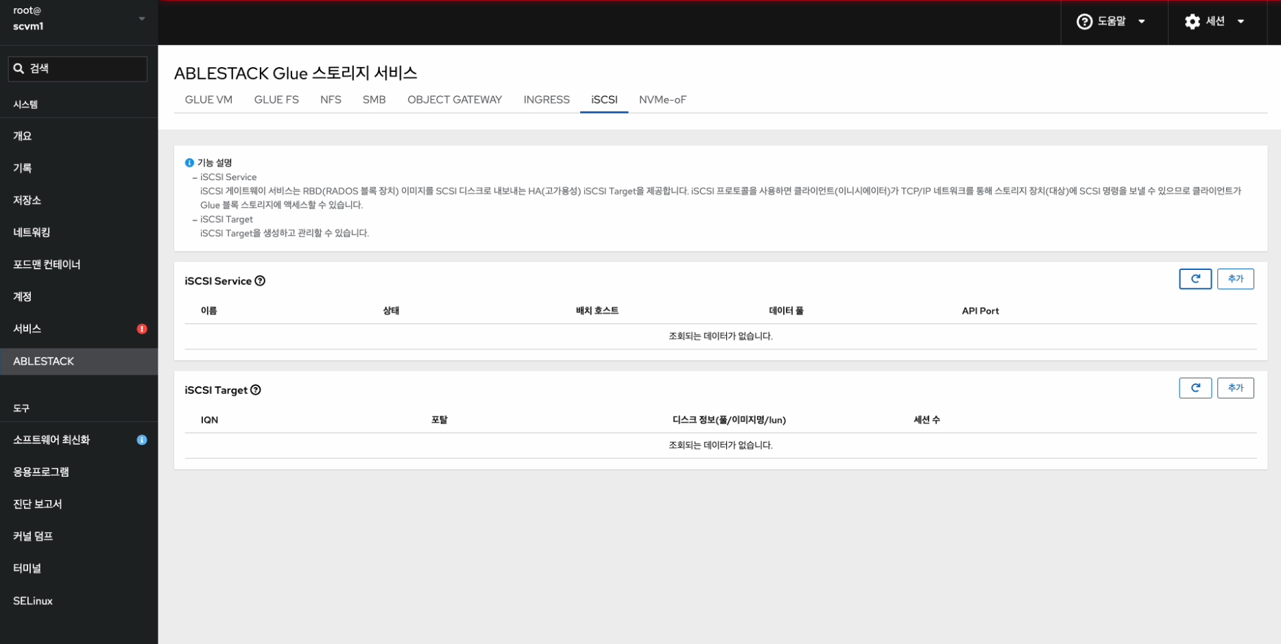 ABLESTACK Glue iSCSI 서비스를 수정 할 시, 서비스가 정상 동작을 하지 않을 수도 있습니다.