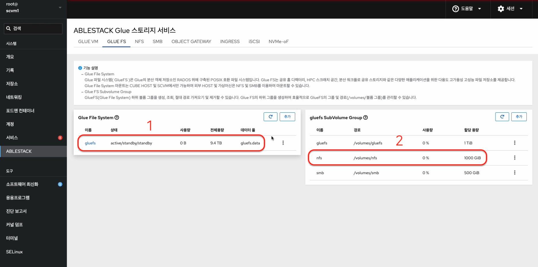 - Glue FS Service 및 Glue NFS Subvolume Group을 확인하는 화면입니다.