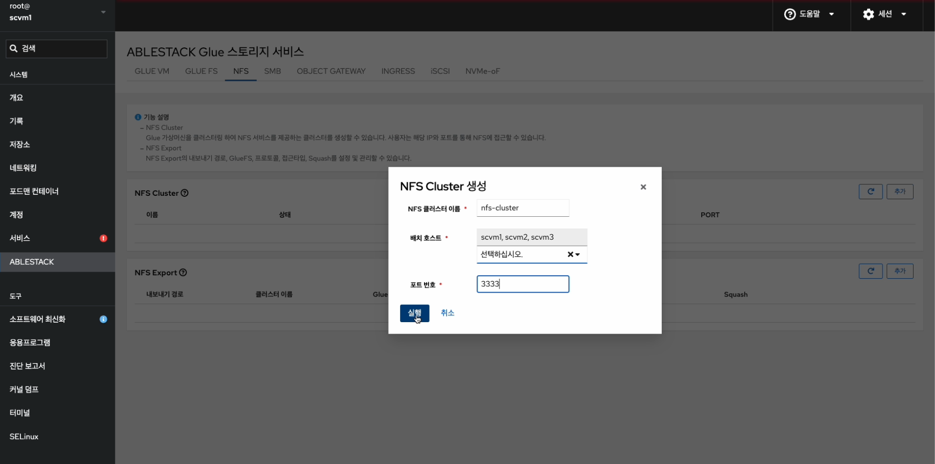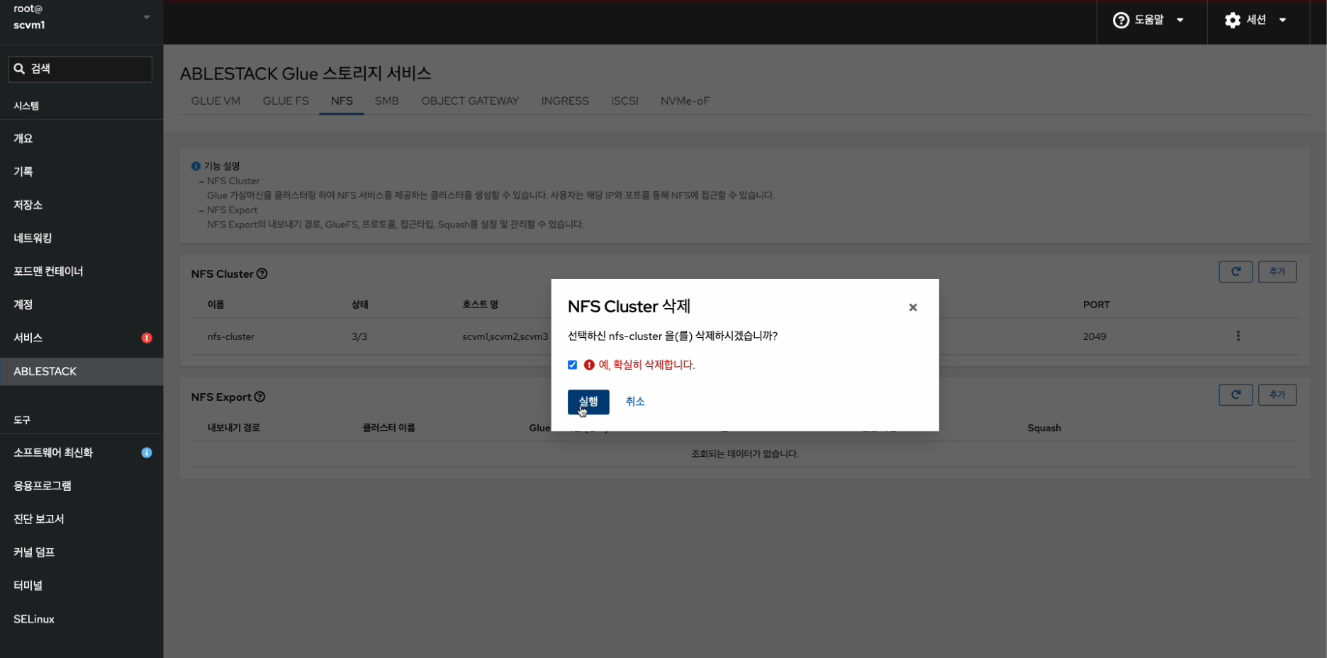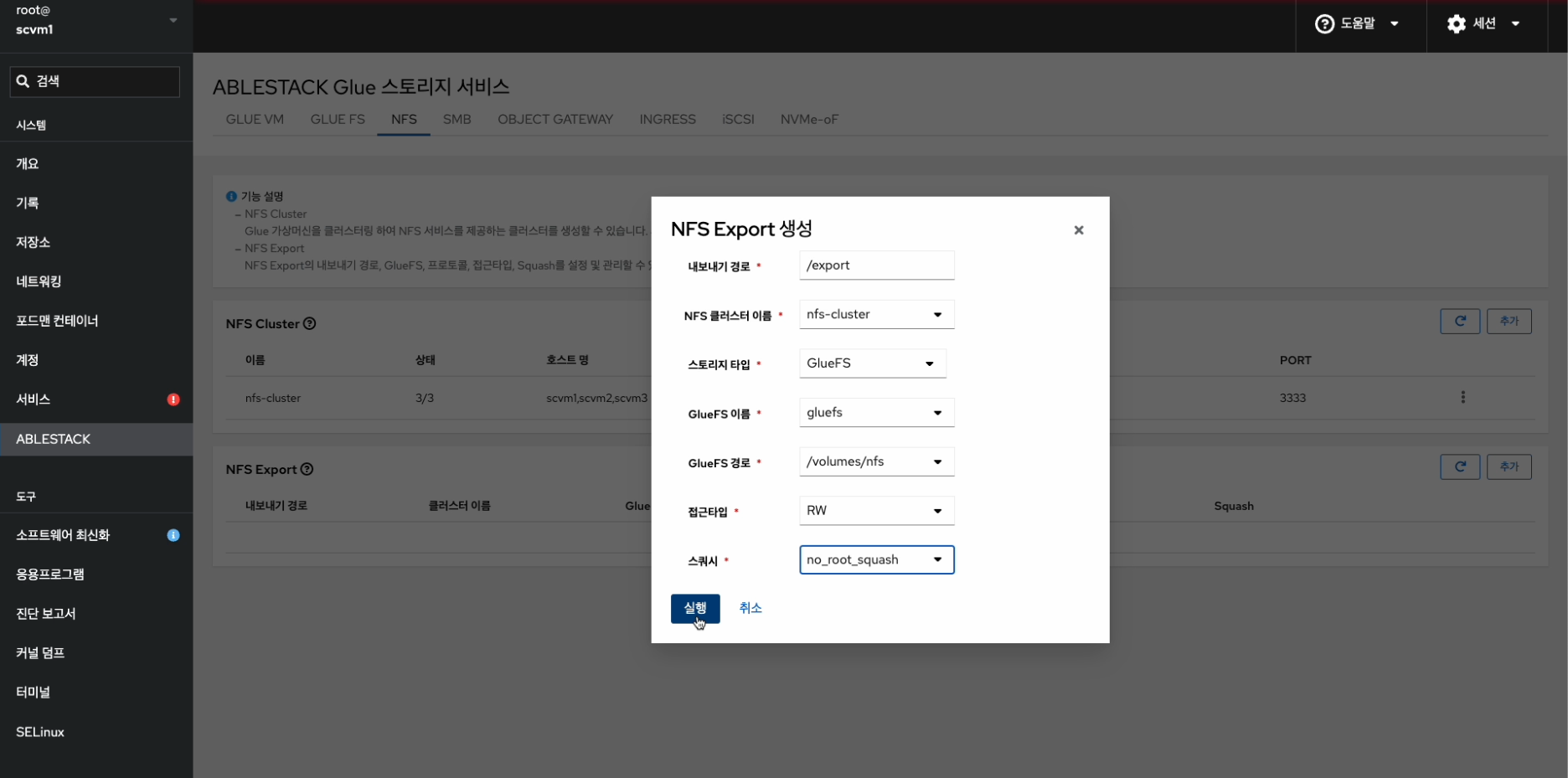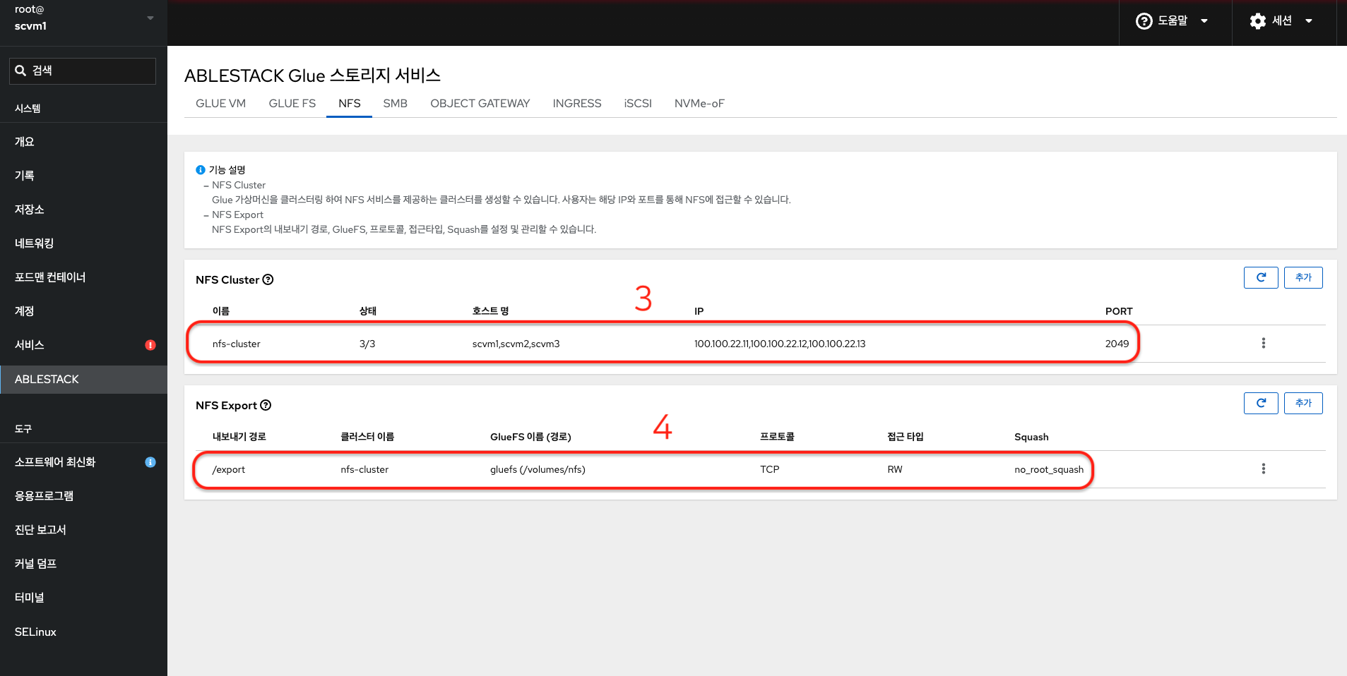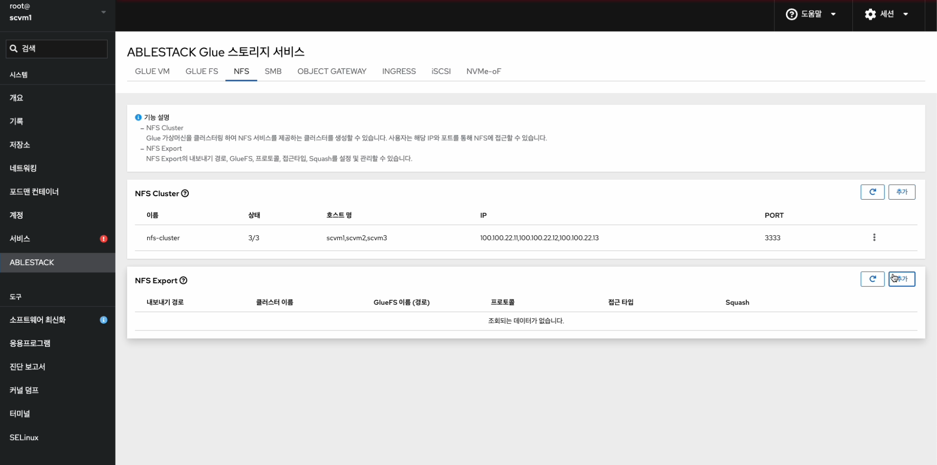 - Glue NFS Cluster Service 및 Glue NFS Export를 확인하는 화면입니다.