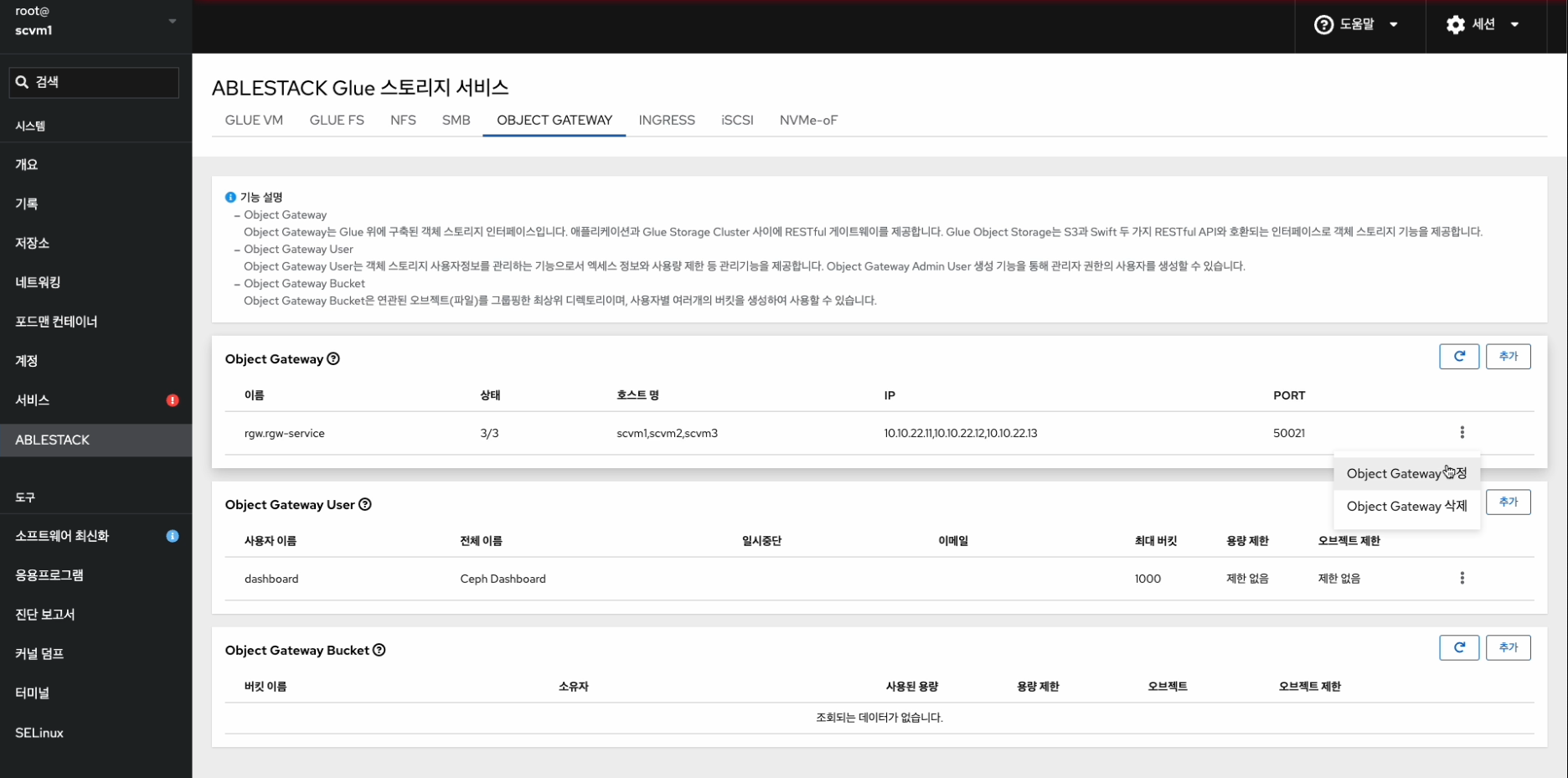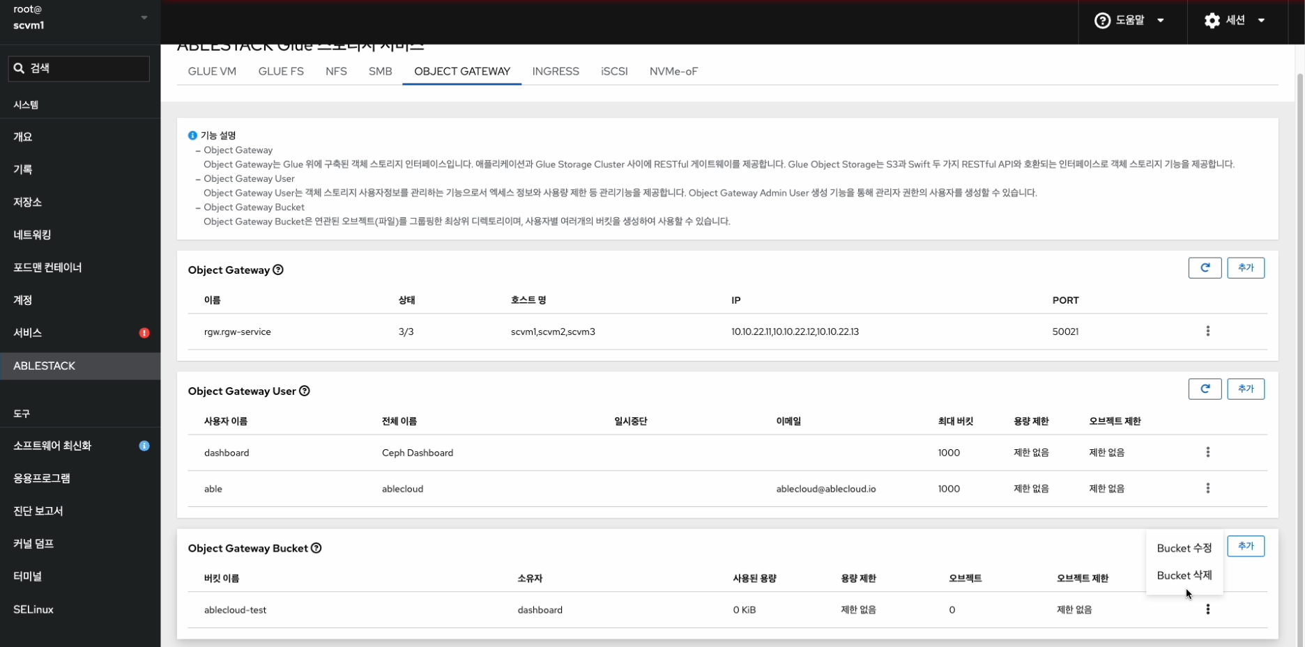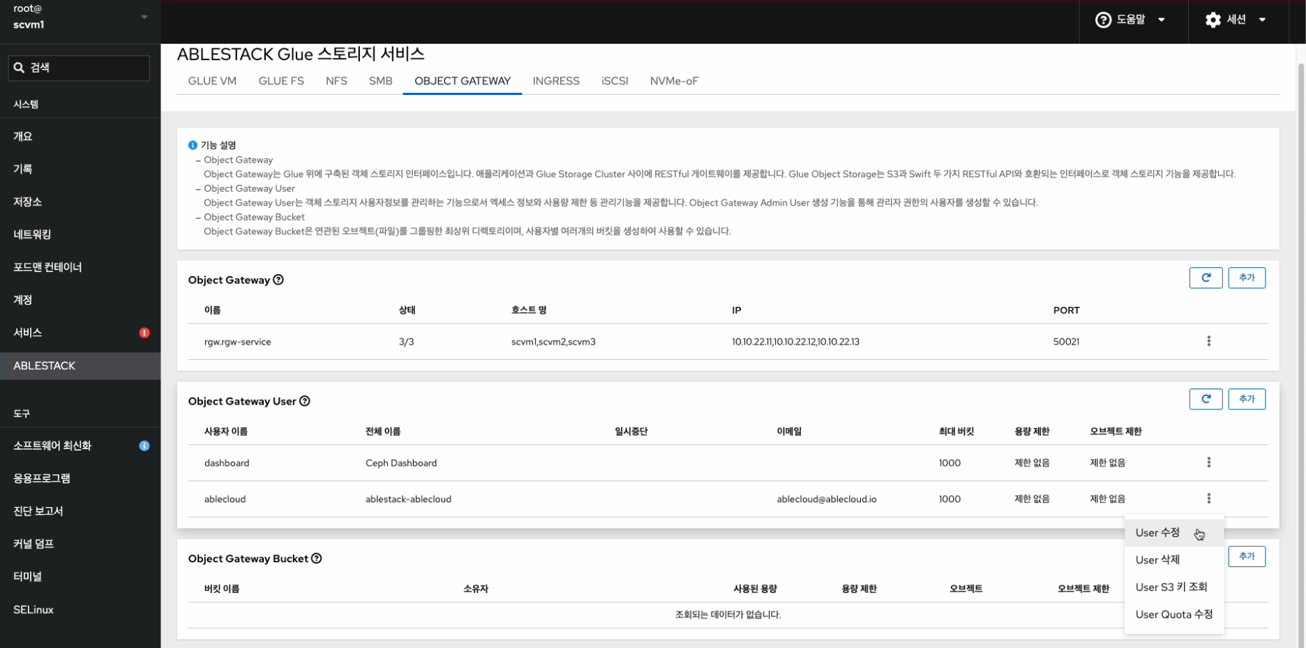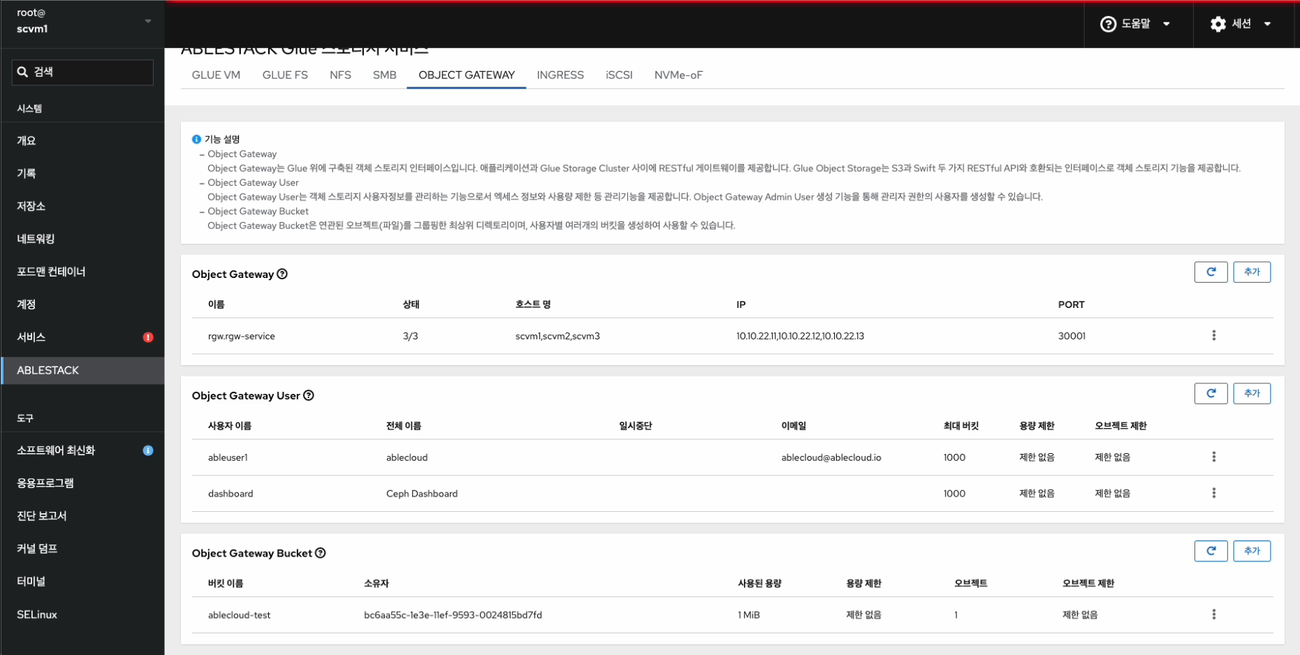 ABLESTACK Glue Service 에서의 Glue Object Gateway 관리 하는 가이드 입니다. 이 문서에서는 ABLESTACK Glue Object Gateway Service 관리 및 제공되는 기능절차를 가이드 하고 있습니다. ABLESTACK Cube의 웹콘솔로 진행되며, 웹 접속 IP는 별도의 표시를 하지 않고 진행됩니다. 기존에 구성된 IP 정보에 맞게 웹콘솔을 접속 하시면 됩니다.
