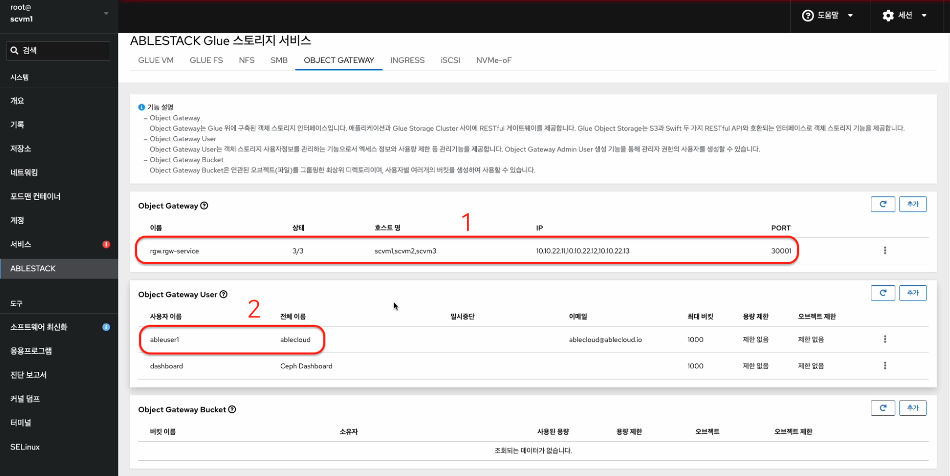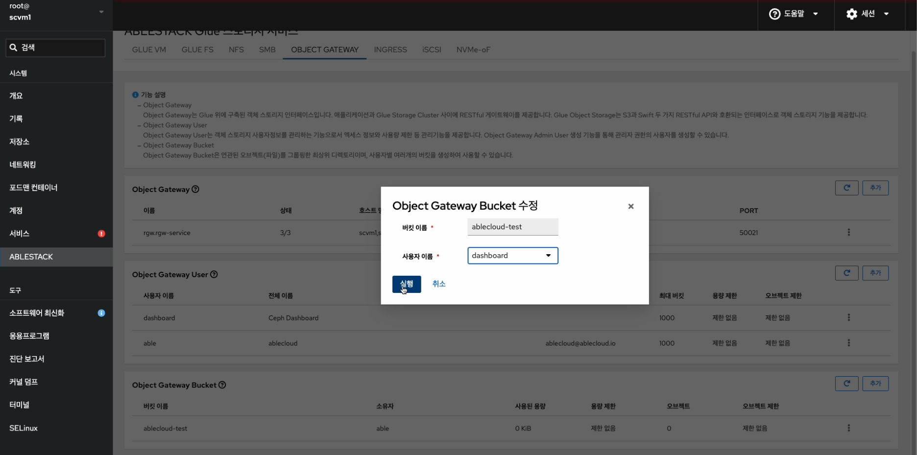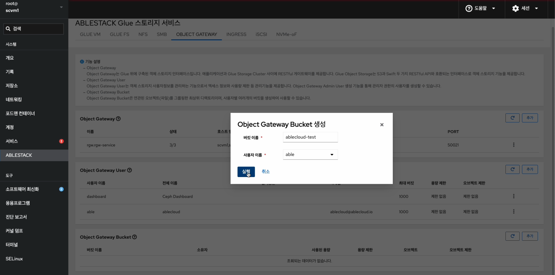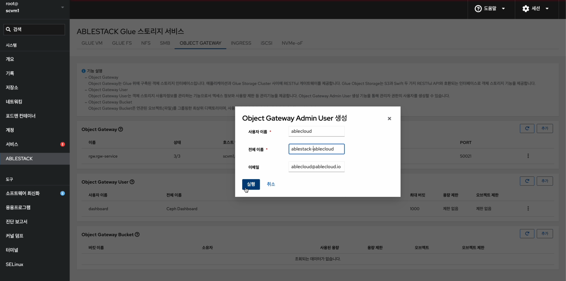 ABLESTACK Glue Service 에서의 Glue Object Gateway 관리 하는 가이드 입니다. 이 문서에서는 ABLESTACK Glue Object Gateway Service 관리 및 제공되는 기능절차를 가이드 하고 있습니다. ABLESTACK Cube의 웹콘솔로 진행되며, 웹 접속 IP는 별도의 표시를 하지 않고 진행됩니다. 기존에 구성된 IP 정보에 맞게 웹콘솔을 접속 하시면 됩니다.