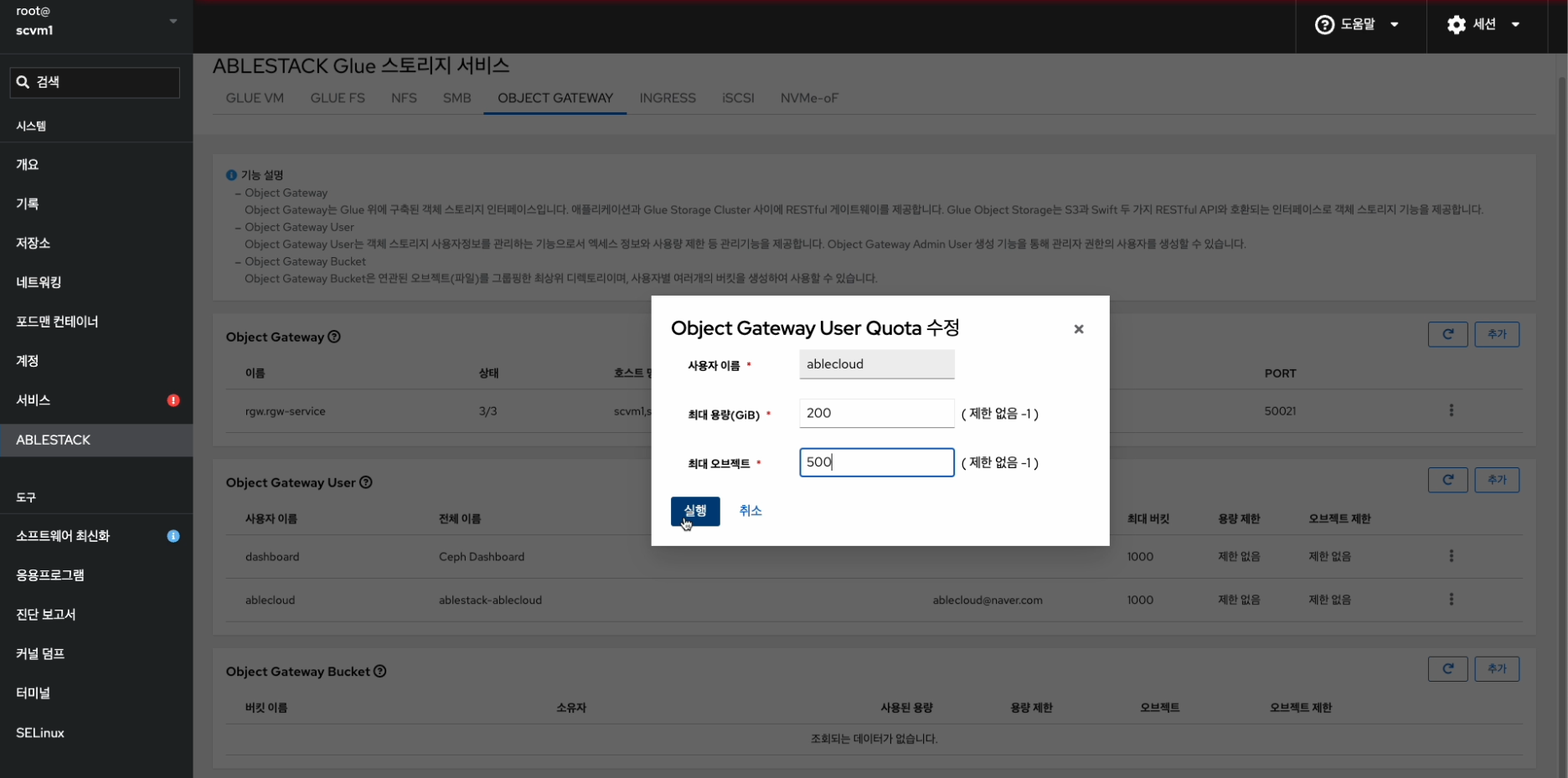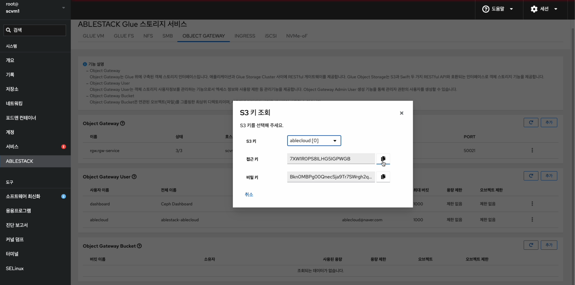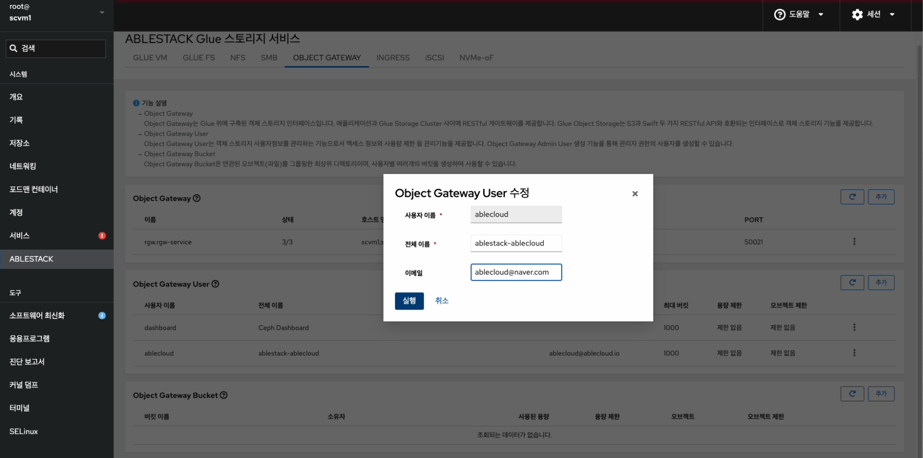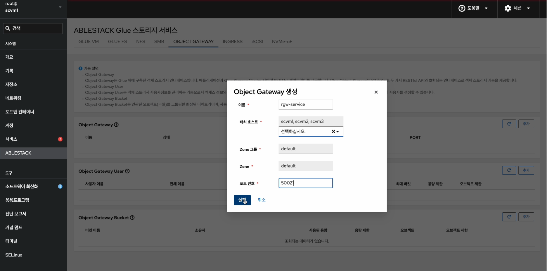 ABLESTACK Glue Service 에서의 Glue Object Gateway 관리 하는 가이드 입니다. 이 문서에서는 ABLESTACK Glue Object Gateway Service 관리 및 제공되는 기능절차를 가이드 하고 있습니다. ABLESTACK Cube의 웹콘솔로 진행되며, 웹 접속 IP는 별도의 표시를 하지 않고 진행됩니다. 기존에 구성된 IP 정보에 맞게 웹콘솔을 접속 하시면 됩니다.