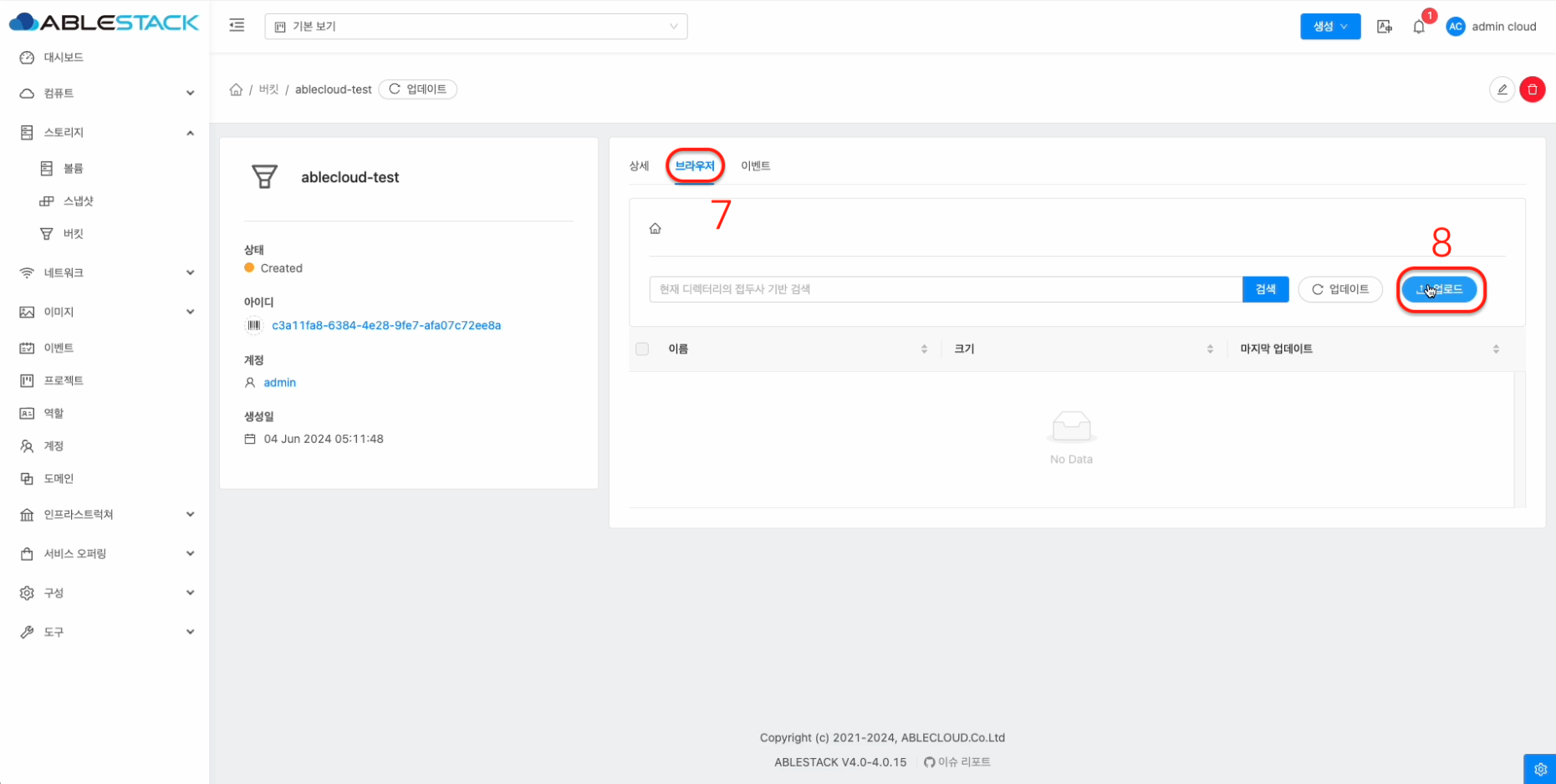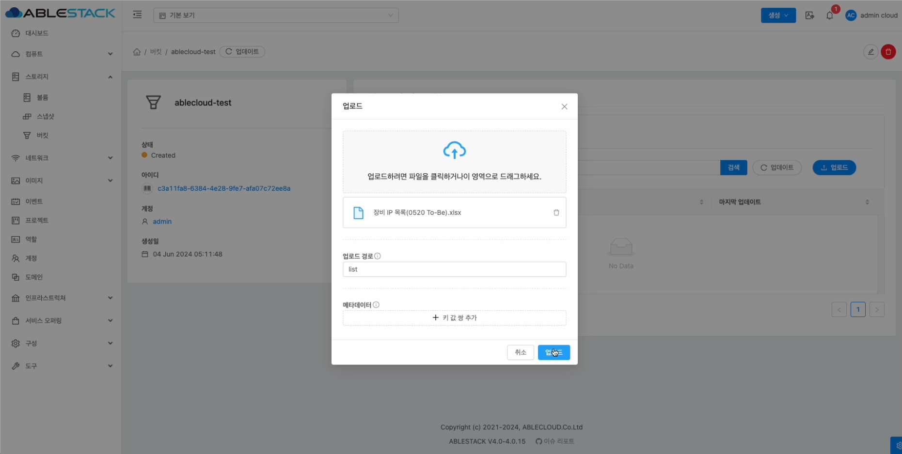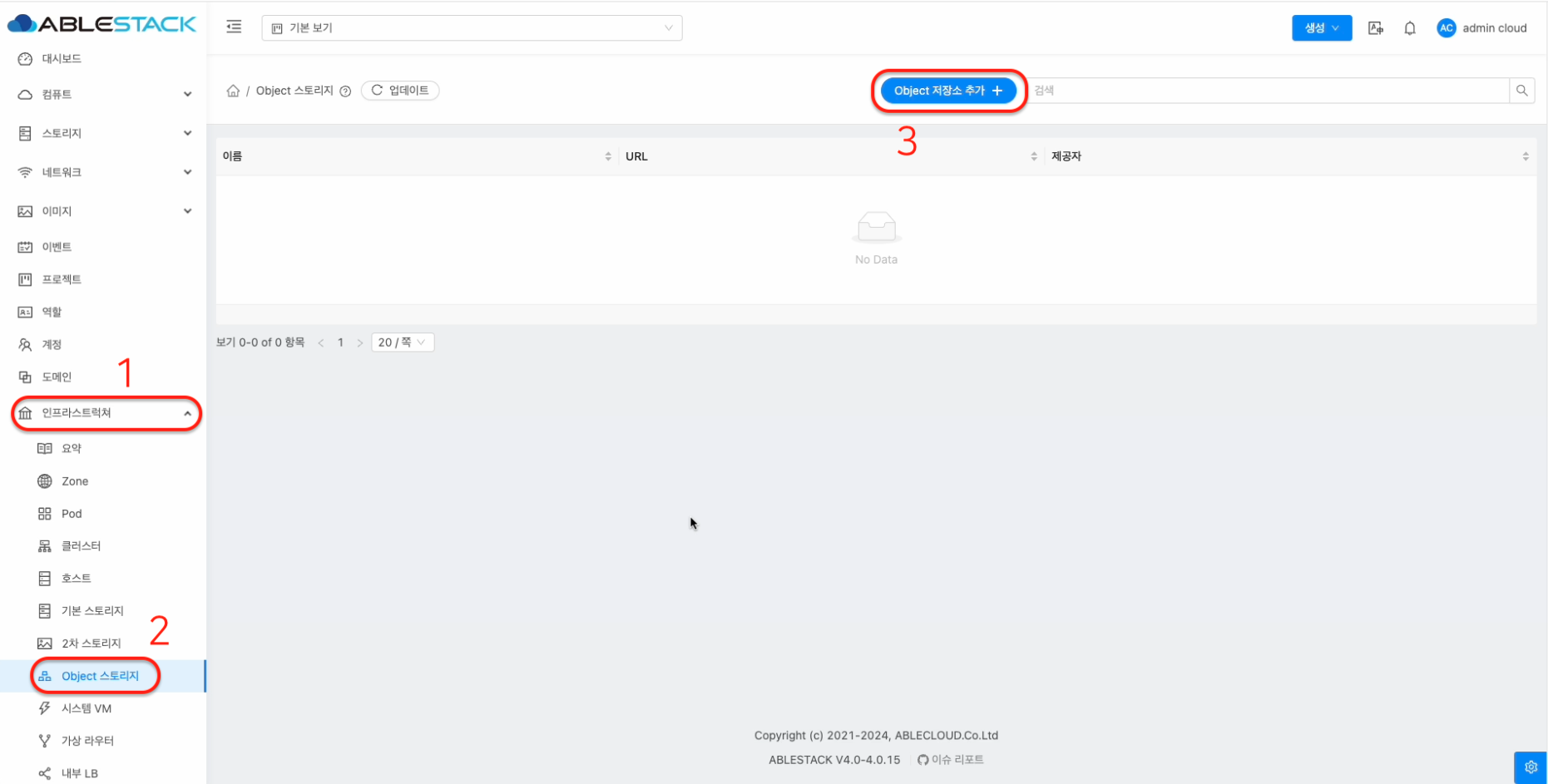- Object 스토리지 : 스토리지 저장소를 선택 합니다.