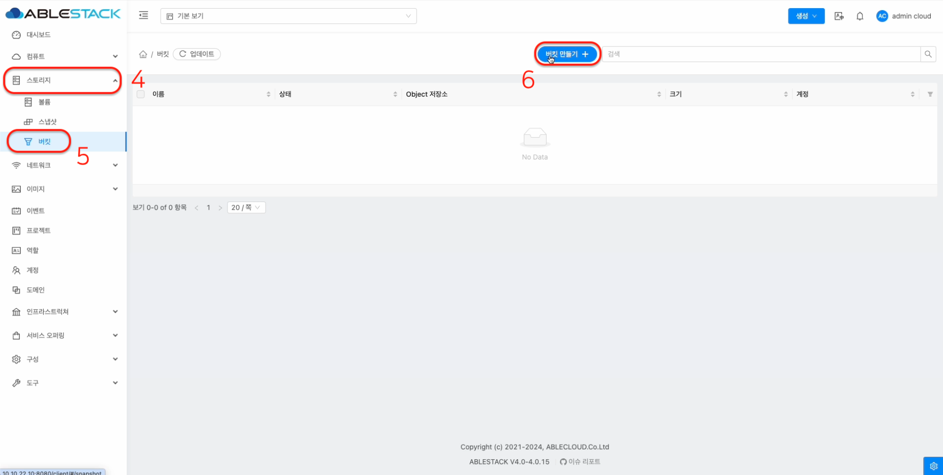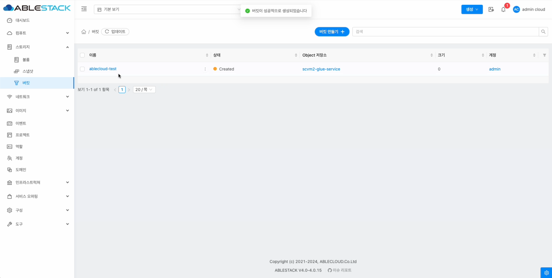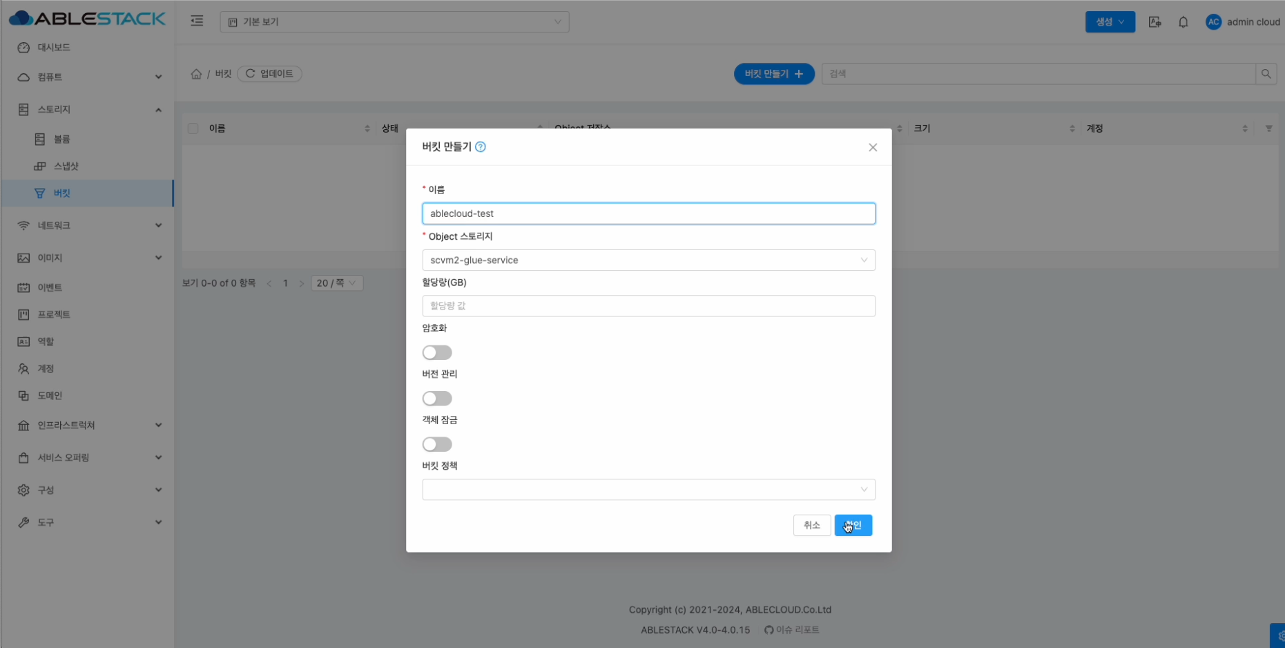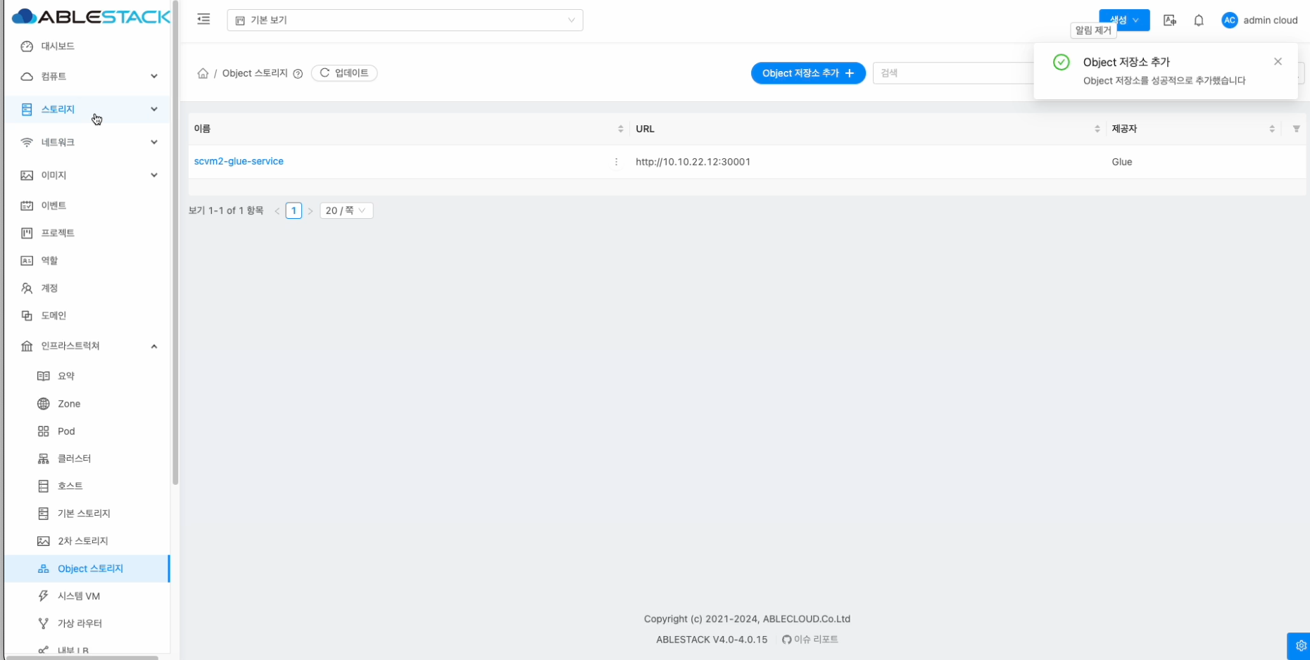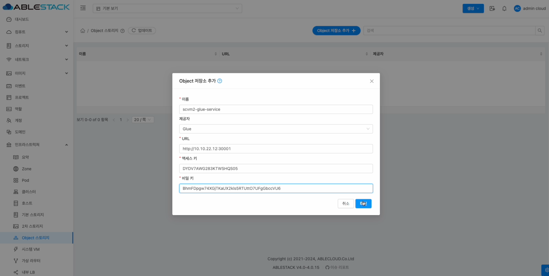 현재 Glue Service 버전에서는 Object Storage Export 기능을 제공하지 않으므로 저희 ABLESTACK Mold 제품에서 Object Storage Service를 이용하실 수 있습니다.
