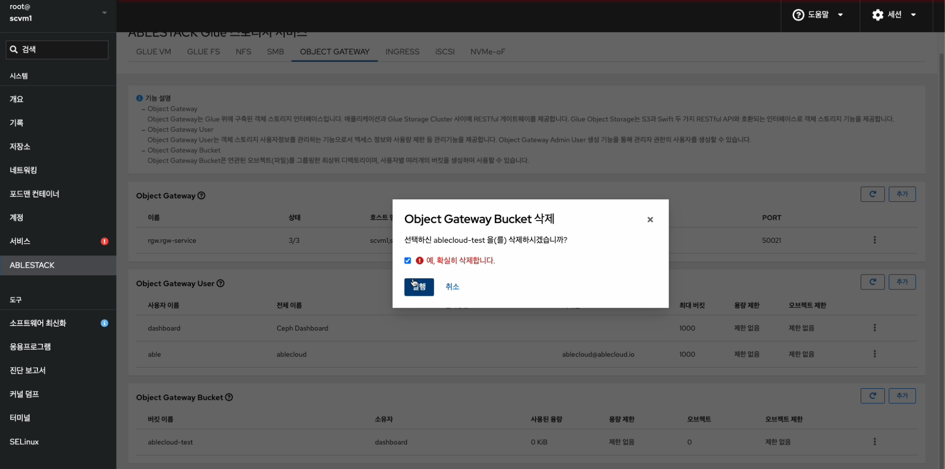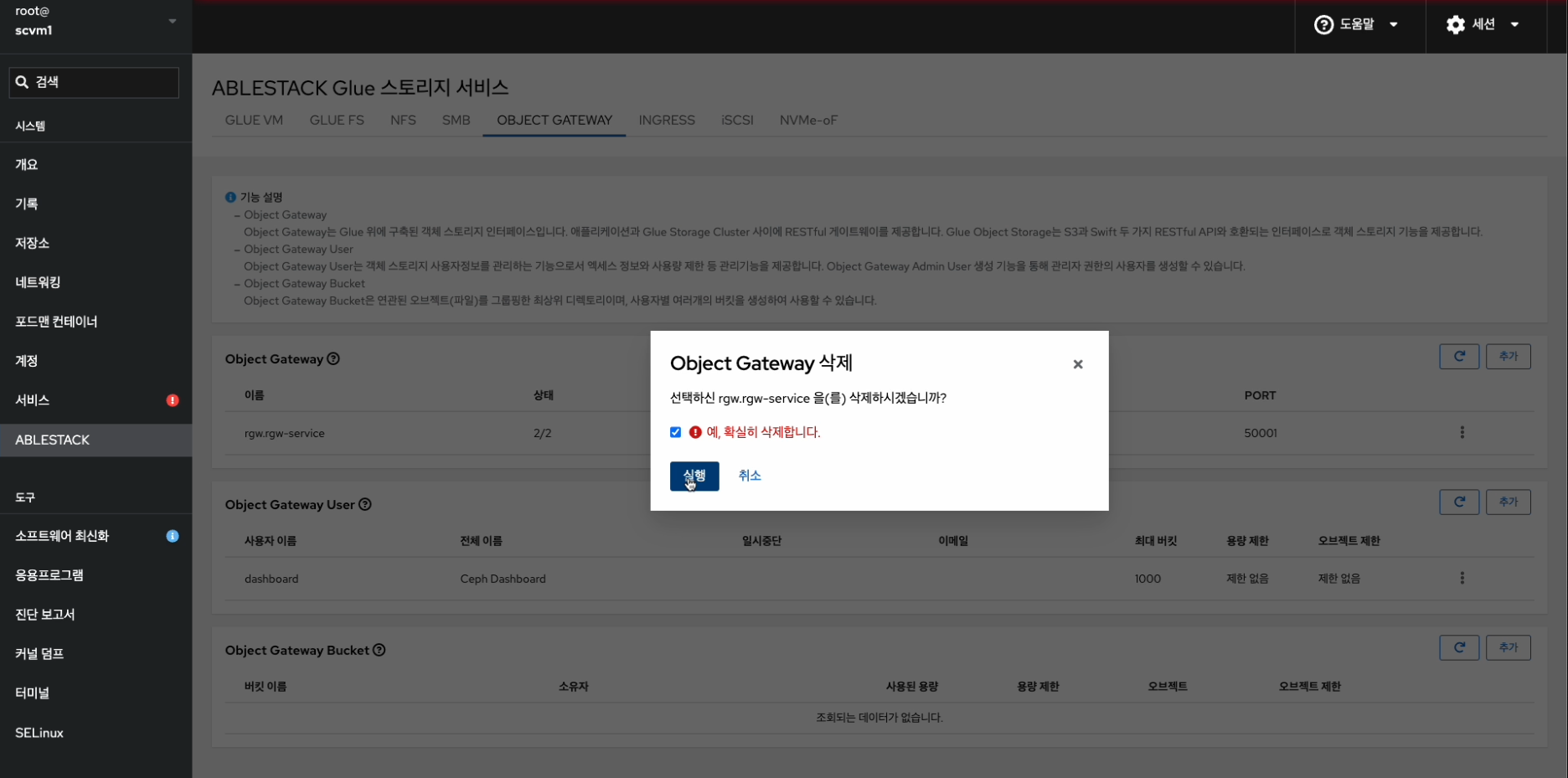 Glue Object Gateway Service를 삭제해도 기존에 있던 유저 및 버킷의 데이터들은 남아 있습니다.