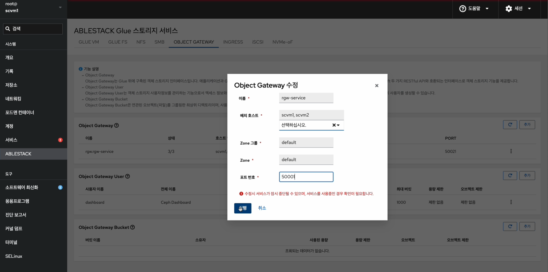 Glue Object Gateway Service의 상태가 모두 정상으로 실행 되는지 확인 후, 작업 하시길 바랍니다.