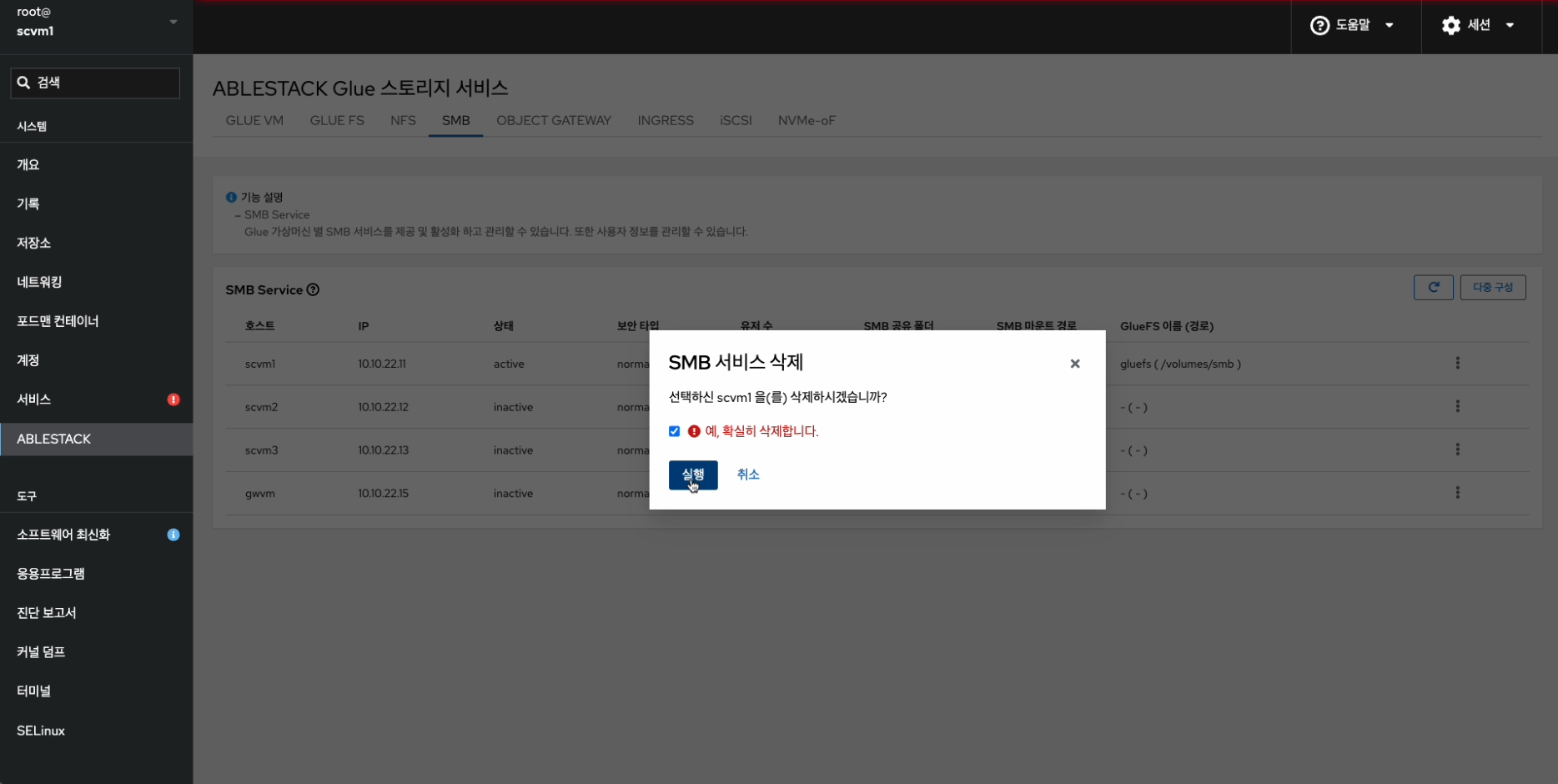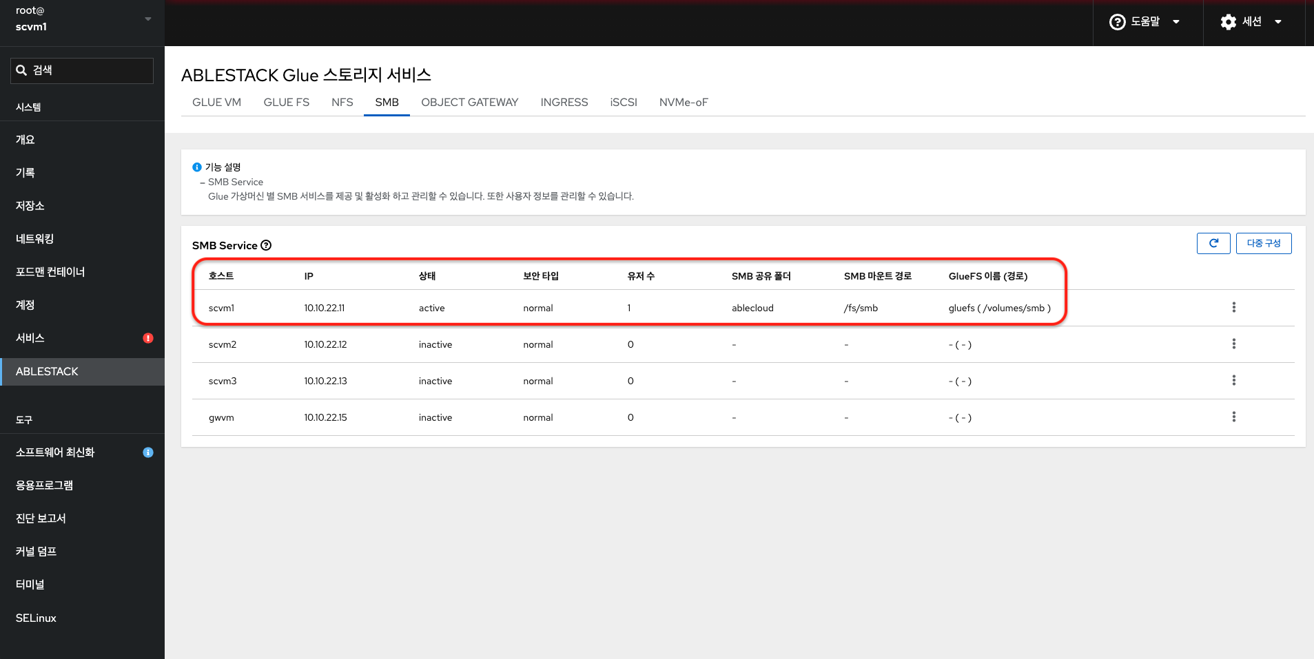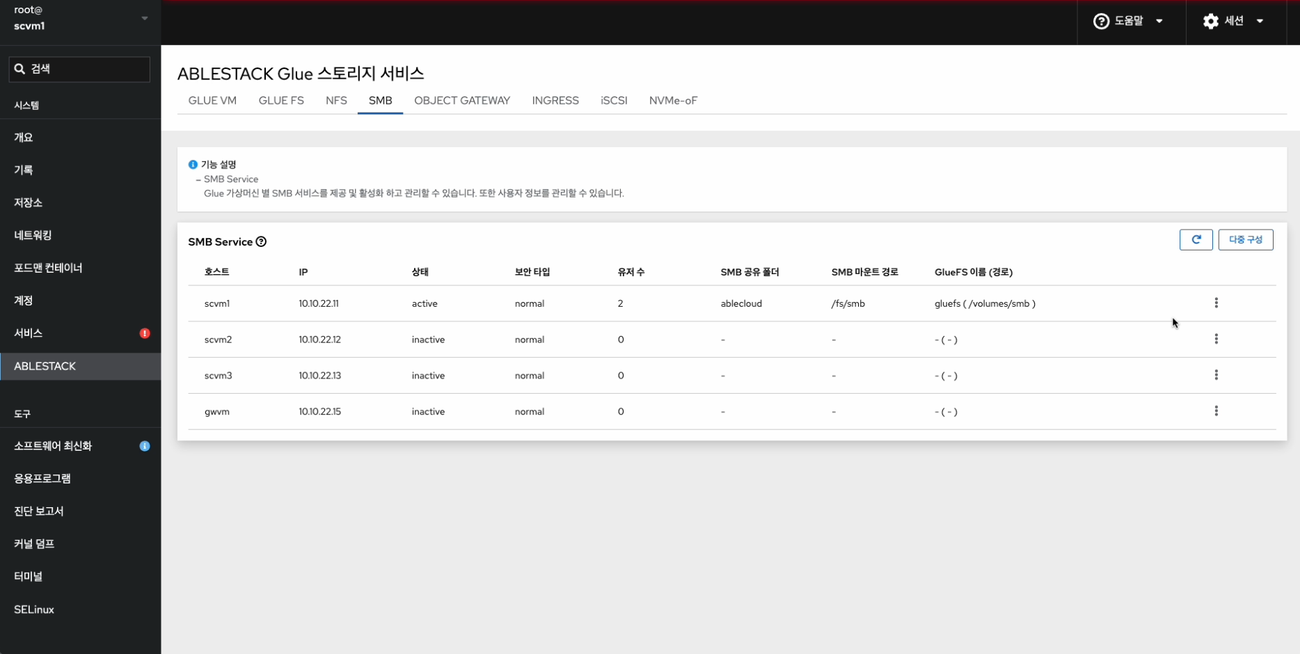 ABLESTACK Glue Service는 호스트가 아닌 Storage Center Virtual Machine(SCVM)에서 제공되고 있습니다.