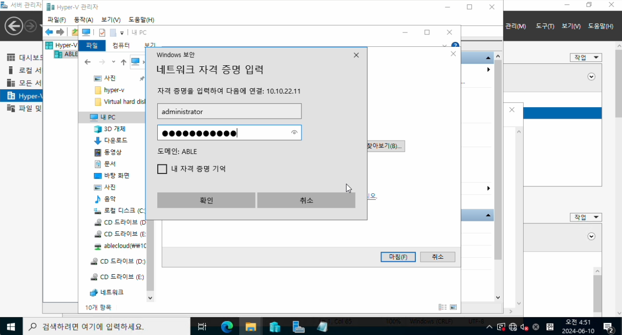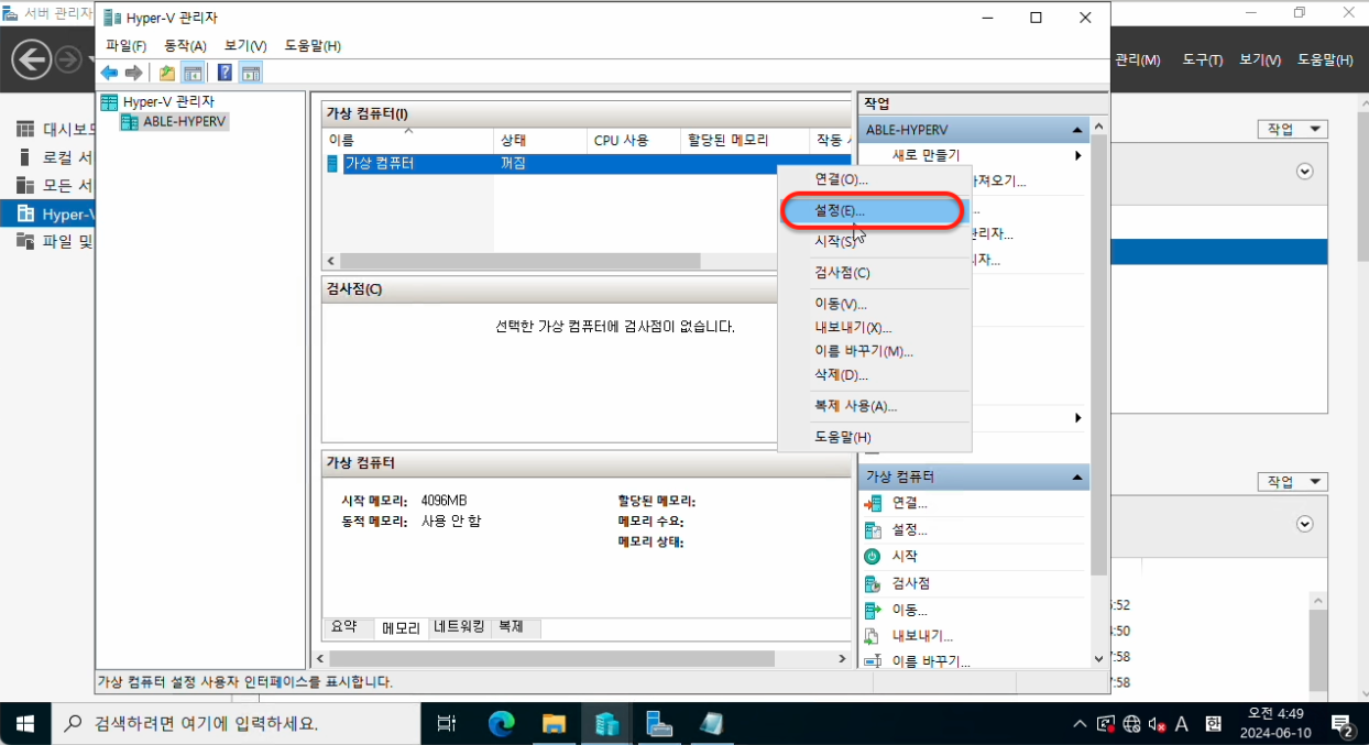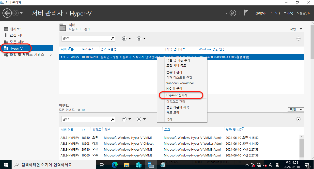 - 해당 서버를 오른쪽 마우스 클릭 하여 Hyper-V 관리자 버튼을 클릭 합니다.