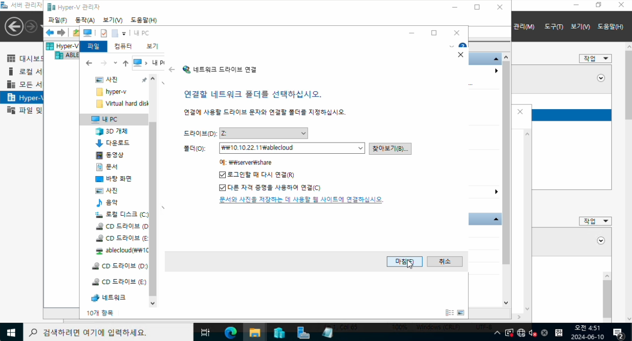- 로그인할 때 다시 연결 및 다른 자격 증명을 사용하여 연결 부분을 해당 사항이 있을 경우 체크하여 마침 버튼을 클릭 합니다.