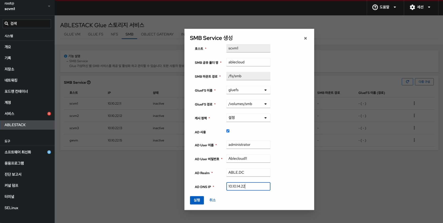 ABLESTACK Glue Service 에서의 Glue Samba 관리 하는 가이드 입니다. 이 문서에서는 ABLESTACK Glue Samba 관리 및 제공되는 기능절차를 가이드 하고 있습니다. ABLESTACK Cube의 웹콘솔로 진행되며, 웹 접속 IP는 별도의 표시를 하지 않고 진행됩니다. 기존에 구성된 IP 정보에 맞게 웹콘솔을 접속 하시면 됩니다.