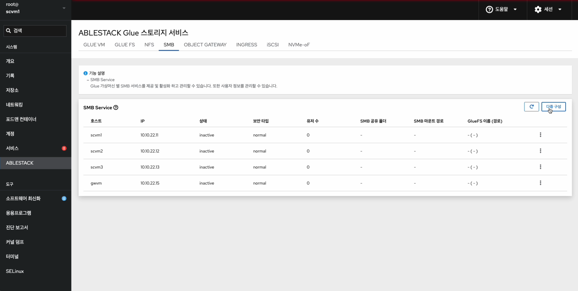 - ABLESTACK 메인 화면에서 상단 SMB 메뉴를 클릭한 화면입니다.