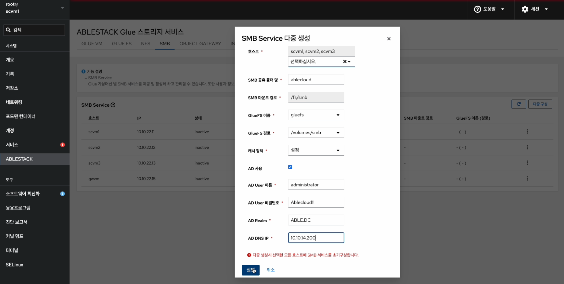 - Glue Samba AD용 다중 구성 서비스가 구성된 화면입니다.
