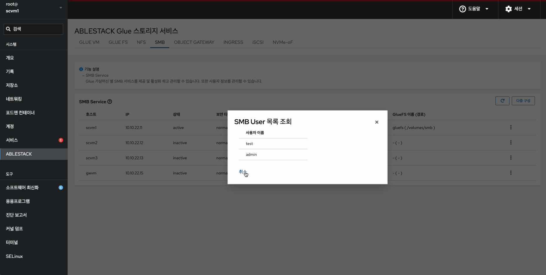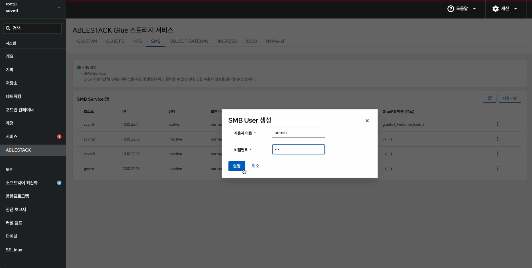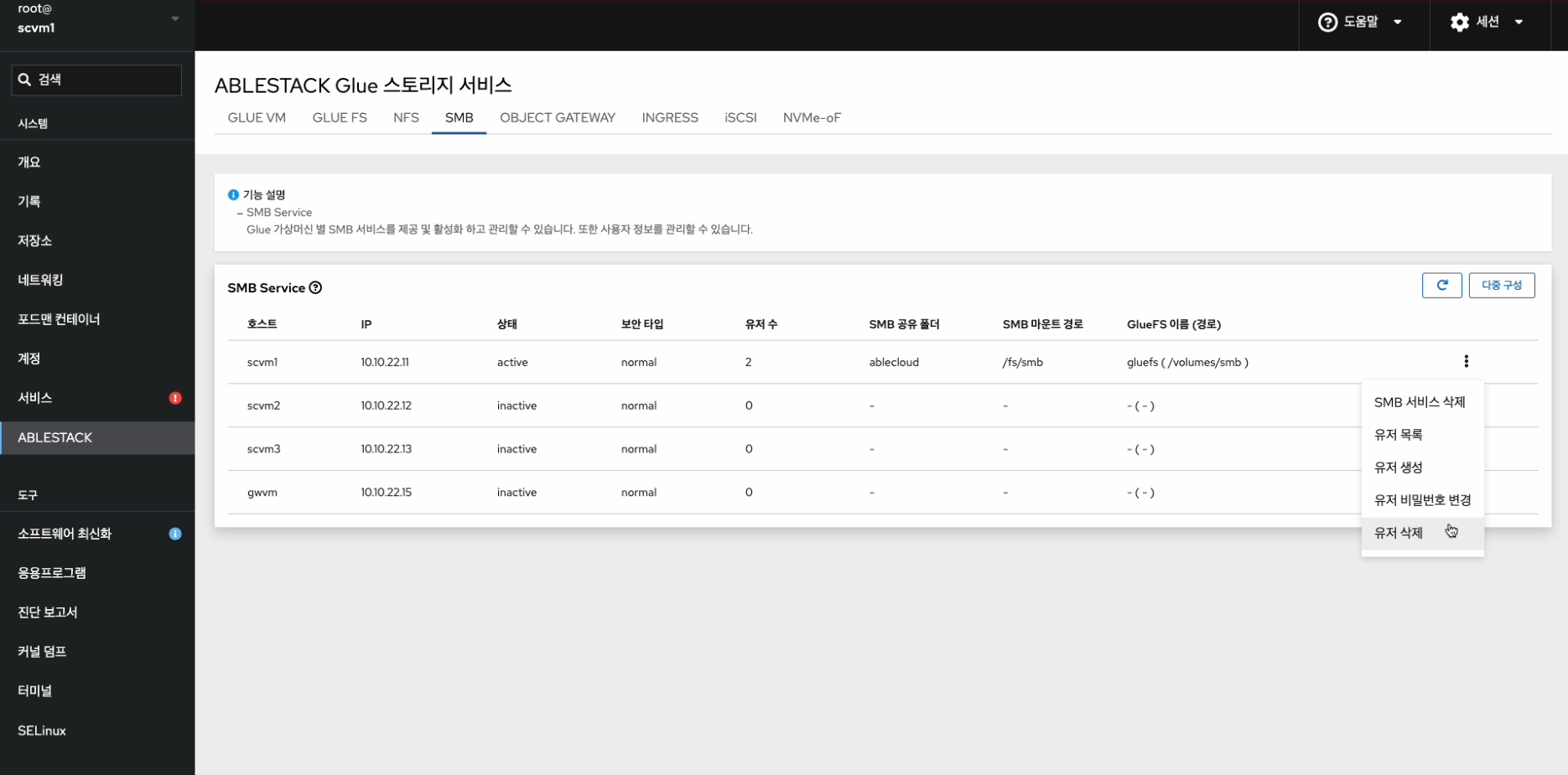 Glue 가상머신 별 SMB 서비스를 제공 및 활성화 하고 관리할 수 있습니다. 또한 사용자 정보를 관리할 수 있습니다.