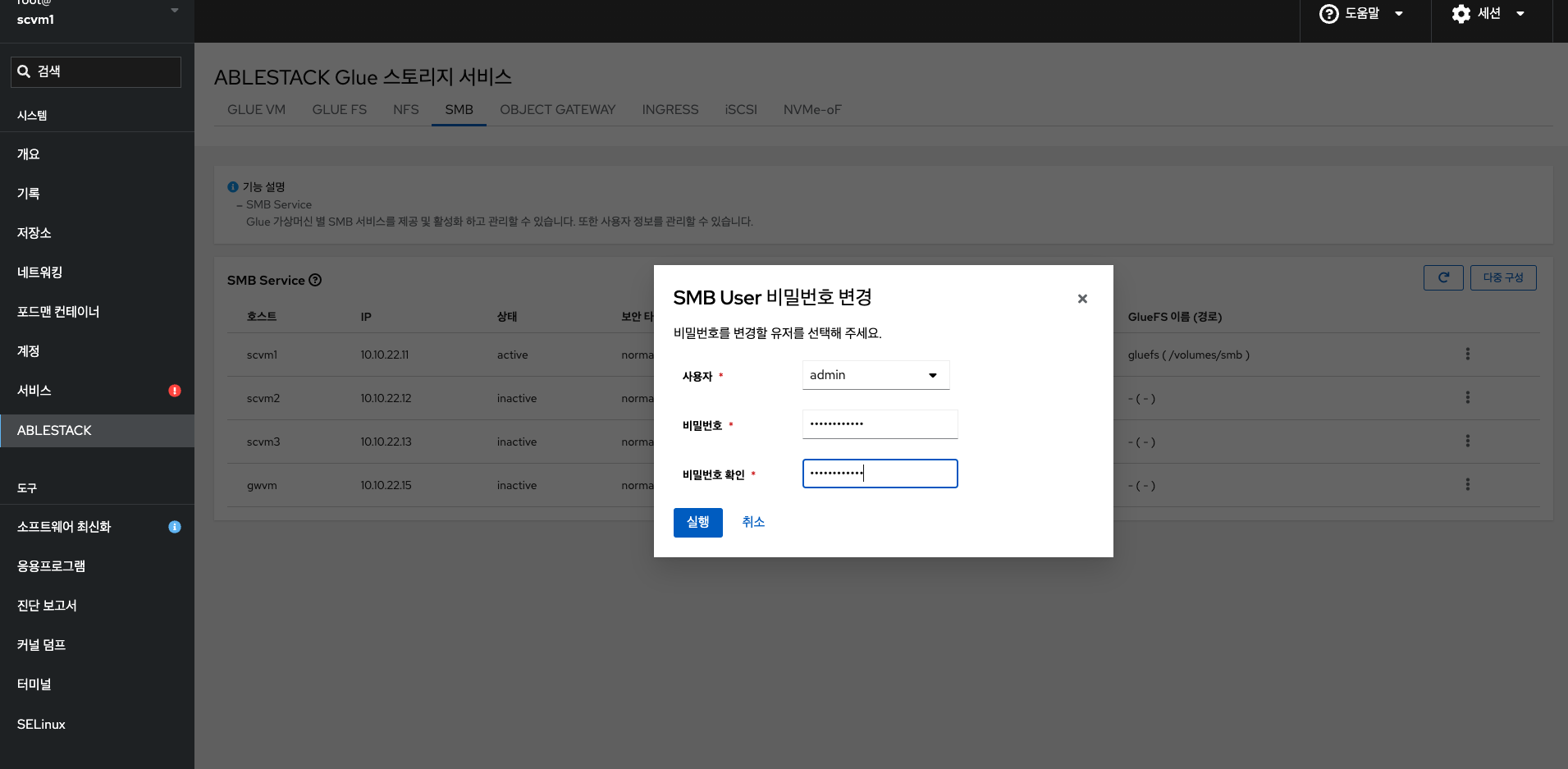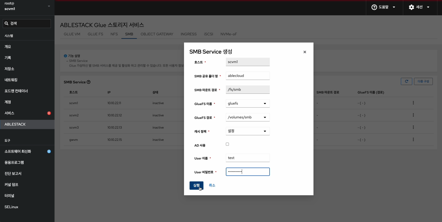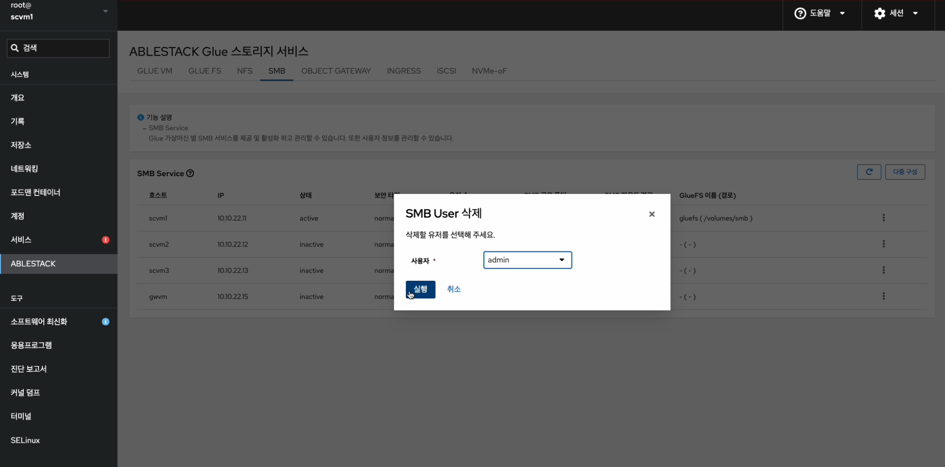 Glue 가상머신 별 SMB 서비스를 제공 및 활성화 하고 관리할 수 있습니다. 또한 사용자 정보를 관리할 수 있습니다.