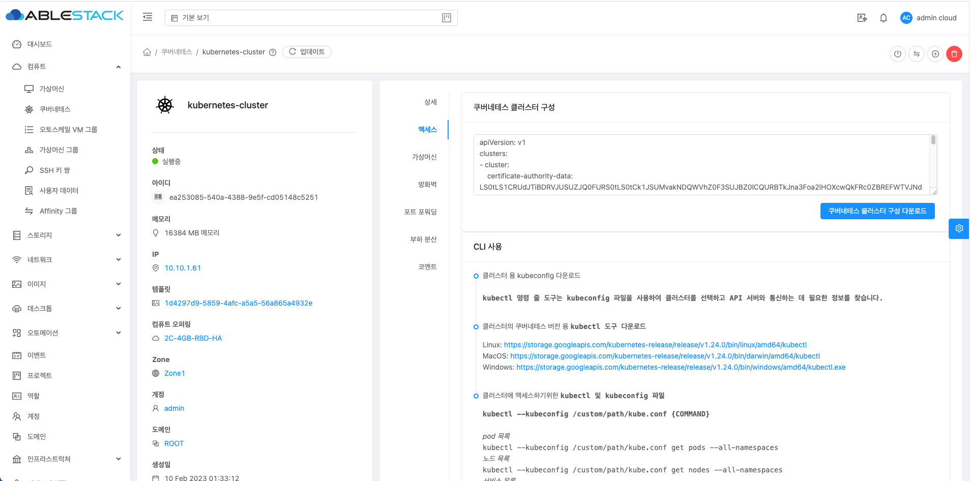 Mold에서 생성된 Kubernetes 설정 및 클러스터 확인을 위해서는 Kubernetes config 파일을 Mold > 컴퓨트 > 쿠버네테스 화면으로 이둥 후 엑세스 탭에서 쿠버네테스 클러스터 구성 다운로드 버튼을 클릭하여 config 파일을 다운로드 해야 합니다.
