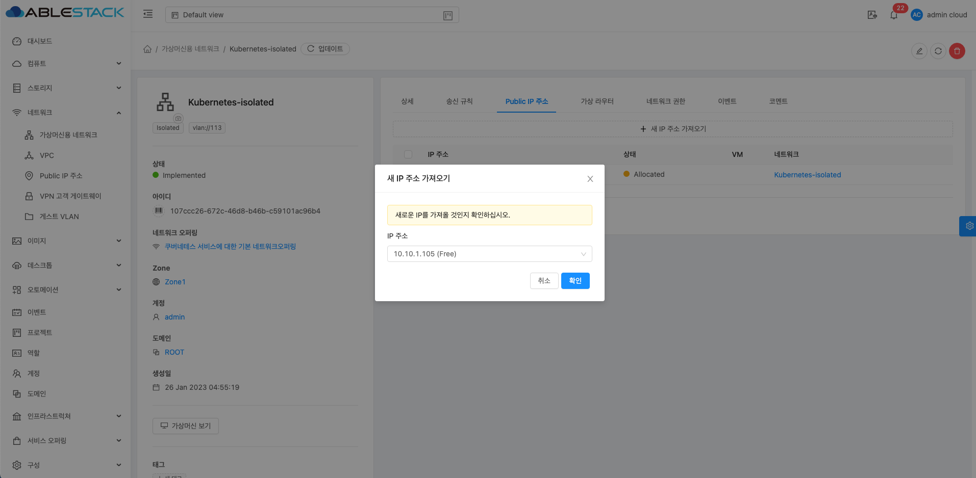 네트워크 > 가상머신용 네트워크 리스트 화면에서 네트워크 선택 후 Public IP 주소 탭에서 새 IP 주소 가져오기 버튼을 클릭 후 IP 선택 후 확인 버튼을 클릭 하여 새 IP 할당