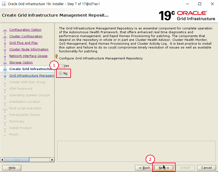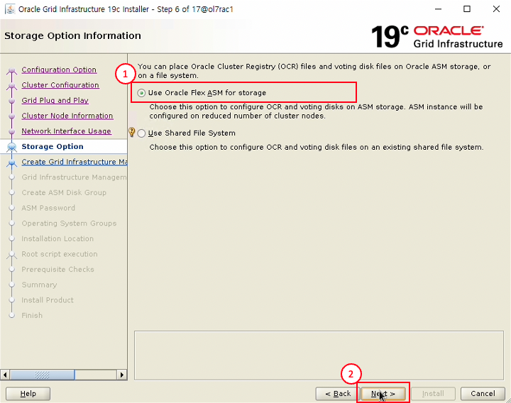 - Use Oracle Flex ASM for storage 선택