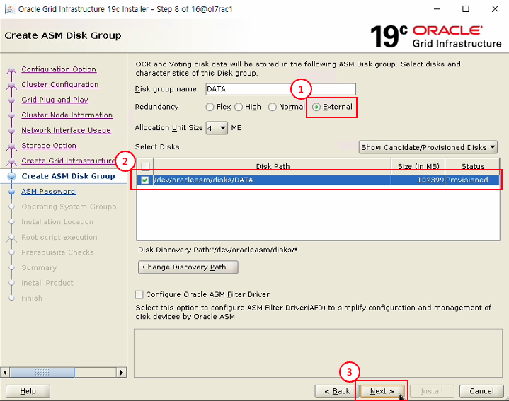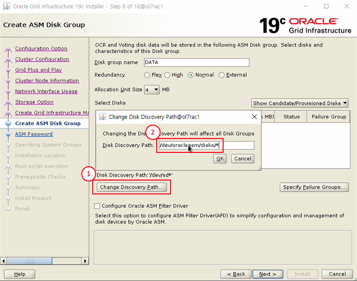 - /dev/oracleasm/disks/DATA 선택