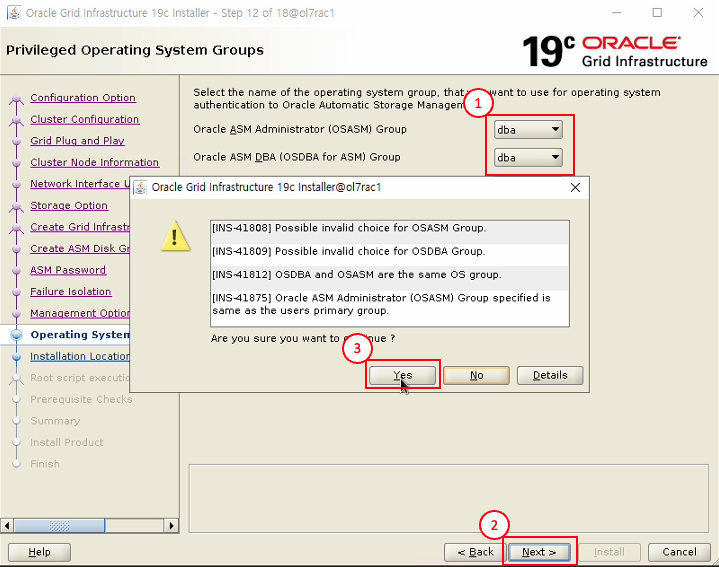 - OSASM group, OSDBA for ASM Group dba로 선택